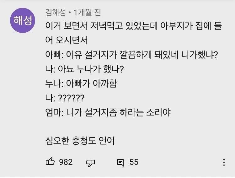 작성자정새복 작성시간 22.08.14 ㅅㅂ 저 설거지 니가했냐 아빠썰 레알임 울집은 청소 ㅇㅇ가 다했어 버전임