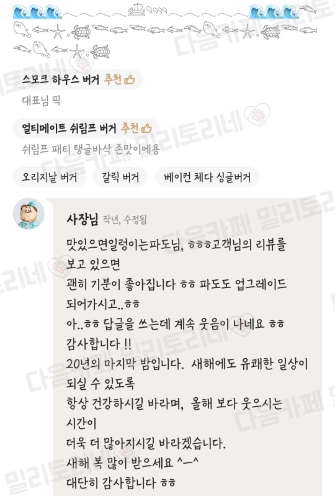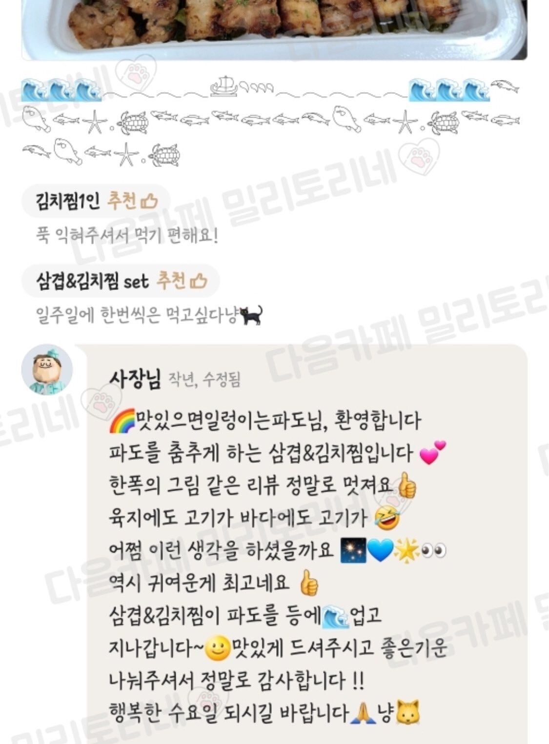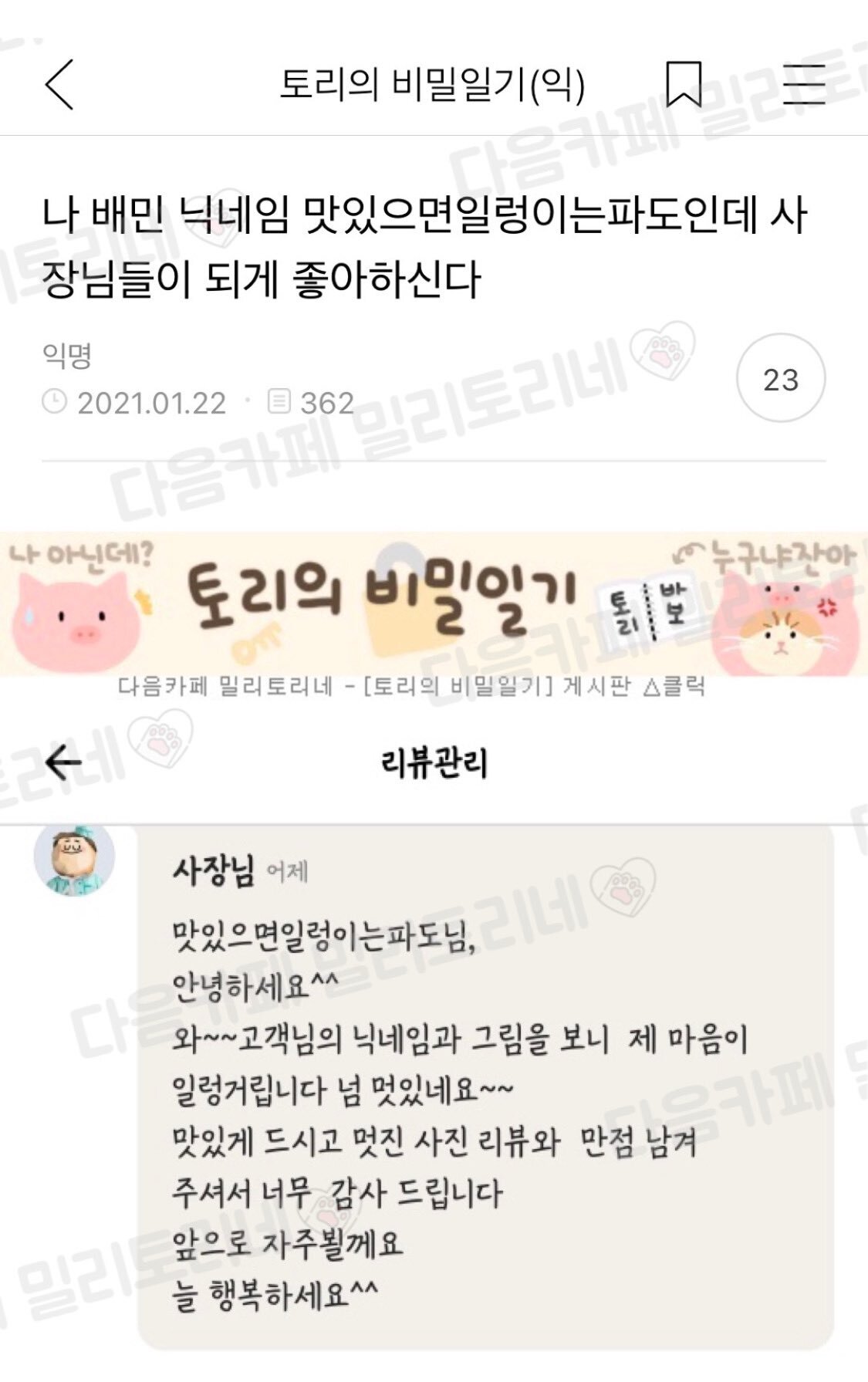 방석 위로 모여라 [감동]나 배민 닉네임 맛있으면 일렁이는 파도인데 사장님들이 되게 좋아하신다 작성시간22.09.03|조회수19,147 목록 댓글 7 글자크기 작게가 글자크기 크게가 출처https://m.cafe.daum.net/baemilytory/91cd/257373?svc=cafeapp나 배민 닉네임 맛있으면 일렁이는 파도인데 사장님들이 되게 좋아하신다다음카페 밀리토리네 - [신문보는 밀리] 게시판 △ 클릭 △ 허락댓 (클릭시 원글로 이동)m.cafe.daum.net 다음검색 현재 게시글 추가 기능 열기 북마크 공유하기 신고 센터로 신고 댓글 7 댓글 리스트 작성시간 22.09.03 ㄱㅇㅇ 훈훈 작성시간 22.09.03 귀여워ㅋㅋㅋㅋㅋㅋㅋㅋㅋㅋㅋㅋㅋ 작성시간 22.09.03 ㄱㅇㅇ 작성시간 22.09.03 ㄱㅇㅇ ㅠㅠㅠ 작성시간 22.09.03 아 넘 따숩다 카페 방문해 더 많은 댓글 만나기!