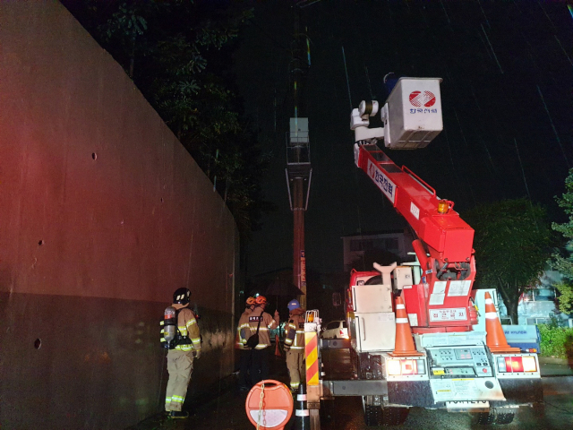 6일 오전 광주 광산구 소촌동 한 전봇대에서 전력 당국이 정전 피해를 복구하고 있다. 제11호 태풍 '힌남노'의 강풍 등으로 이날 광산구 소촌동 일원 상가와 주택 등 991개소에서 정전 피해가 발생했다. 광주 광산소방서 제공. 연합뉴스