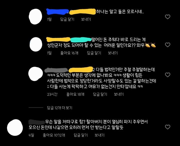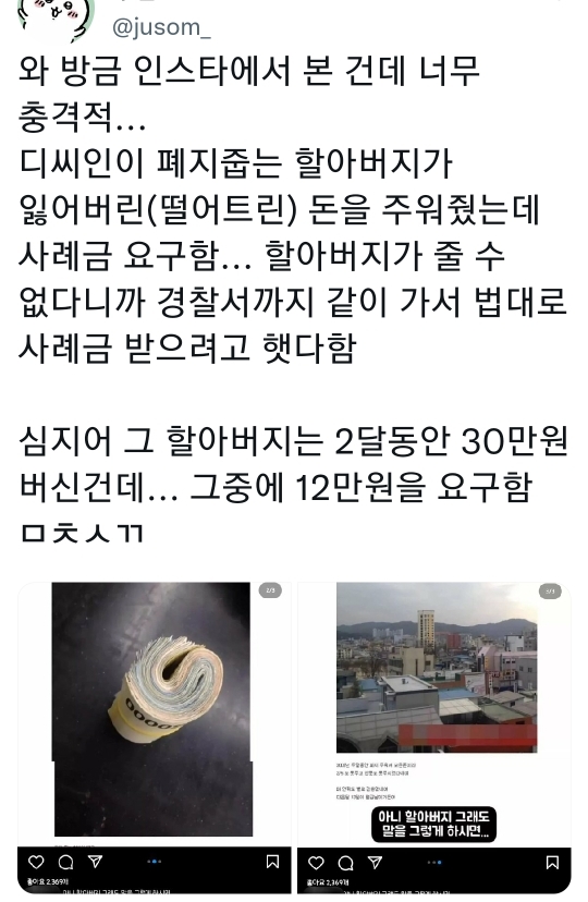 [기타]폐지 줍는 할아버지가 떨어트린 돈을 주워준 디씨인 작성자스르릉.|작성시간22.09.23|조회수3,095 목록 댓글 35 글자크기 작게가 글자크기 크게가 https://twitter.com/jusom_/status/1572962288948383744?t=PqoPYCNJpEnT707VQzq1-g&s=19 다음검색 현재 게시글 추가 기능 열기 북마크 공유하기 신고 센터로 신고 댓글 댓글 35 댓글쓰기 답글쓰기 댓글 리스트 작성자박약 | 작성시간 22.09.24 니들도 똑같이 당해보길 간절히 빈다. 그때도 그렇게 지껄일 수 있는지 진심으로 궁금해지네. 작성자방탄 김남준 | 작성시간 22.09.24 수준떨어져 으 진짜 즈그들도 똑같이 당해봐야돼 작성자도깨비 왕 | 작성시간 22.09.24 ㅅㅂ 지들일애는 온갖 배려 바라는 겋들이 작성자제노야밥먹어잇 | 작성시간 22.09.24 ㅅㅂ인류애 작성자토끼와호랑이 | 작성시간 22.09.24 으휴 댓글 전체보기