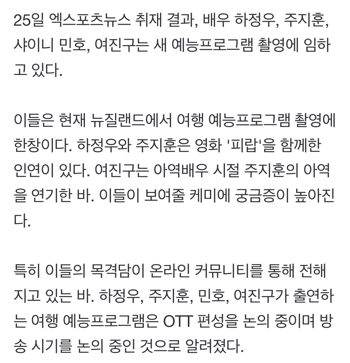 [연예][단독] 하정우·주지훈·민호·여진구, 여행예능으로 뭉쳤다…편성·시기 미정 작성자View|작성시간22.09.25|조회수2,049 목록 댓글 23 글자크기 작게가 글자크기 크게가 https://naver.me/GLAGNc4w[단독] 하정우·주지훈·민호·여진구, 여행예능으로 뭉쳤다…편성·시기 미정하정우, 주지훈, 샤이니 민호(최민호), 여진구가 여행 예능으로 뭉쳤다. 25일 엑스포츠뉴스 취재 결과, 배우 하정우, 주지훈, 샤이니 민호, 여진구는 새 예능프로그램 촬영에 임하고 있다. 이들은 n.news.naver.com현재 촬영중 해외팬이 찍은 사진 다음검색 현재 게시글 추가 기능 열기 북마크 공유하기 신고 센터로 신고 댓글 댓글 23 댓글쓰기 답글쓰기 댓글 리스트 작성자댄케이크 | 작성시간 22.09.25 진구 빼ㅠ 작성자@pockyjr | 작성시간 22.09.25 열림교회닫힘교회도 아니고.. 작성자우영우 | 작성시간 22.09.25 무슨 조합이지? 무튼 민호 진구만 나와주세요 작성자시에러 미치광이 | 작성시간 22.09.25 ㅎㅎ. .하씨 주씨는 빠져라 작성자엑소백현 | 작성시간 22.09.26 어...음...왜...조합을... 댓글 전체보기