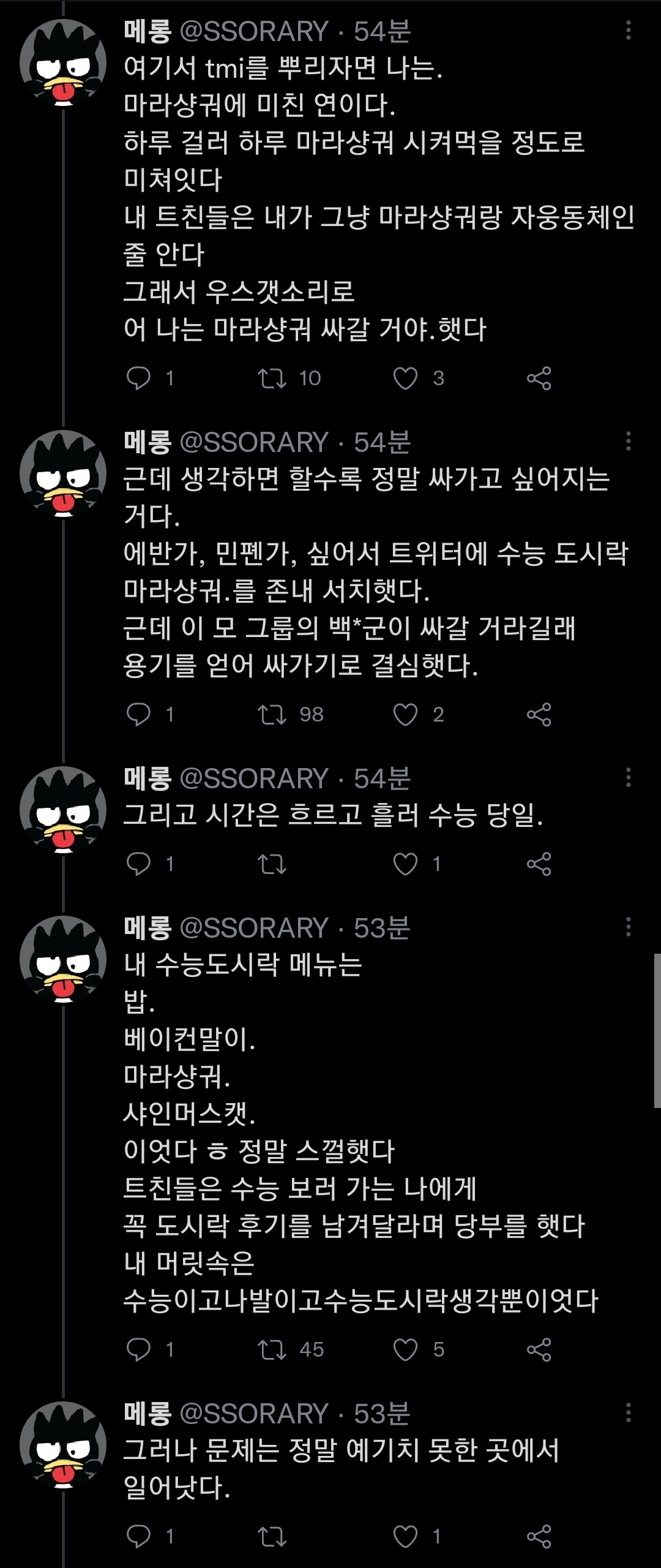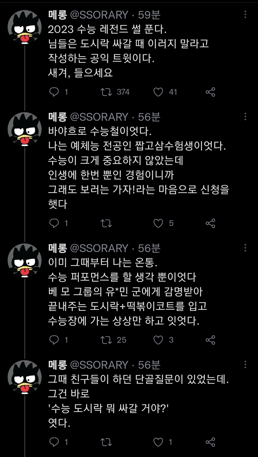 [기타]2023 수능 점심시간 썰 + 도시락 꿀팁 작성자서창빈|작성시간22.11.17|조회수4,522 목록 댓글 28 글자크기 작게가 글자크기 크게가 링크 속 타래로 이어서 •••https://twitter.com/SSORARY/status/1593170444810846209?t=U2qHcFPg5gOGbH4JQQMS0Q&s=19 다음검색 현재 게시글 추가 기능 열기 북마크 공유하기 신고 센터로 신고 댓글 댓글 28 댓글쓰기 답글쓰기 댓글 리스트 작성자양송이 | 작성시간 22.11.17 아낰ㅋㅋㅋㅋㅋㅋㅋ 작성자do_02 | 작성시간 22.11.17 ㅋㅋㅋㅋㅋㅋㅋㅋㅋㅋㅋㅋㅋ아웃곀ㅋㅋㅋㅋㅋ 작성자소환 | 작성시간 22.11.18 아존나웃겨ㅋㅋㅋㅋㅋㅋㅋㅋㅋ 작성자이채영사랑해 | 작성시간 22.11.18 아 귀엽고 웃기다ㅋㅋㅋㅋㅋㅋㅋㅋㅋㅋㅋㅋㅋㅋㅋㅋㅋㅋㅋㅋㅋㅋㅋㅋㅋㅋㅋㅋㅋㅋㅋㅋ 작성자별이 | 작성시간 22.11.18 마지막 짤까지 개웃겨 댓글 전체보기