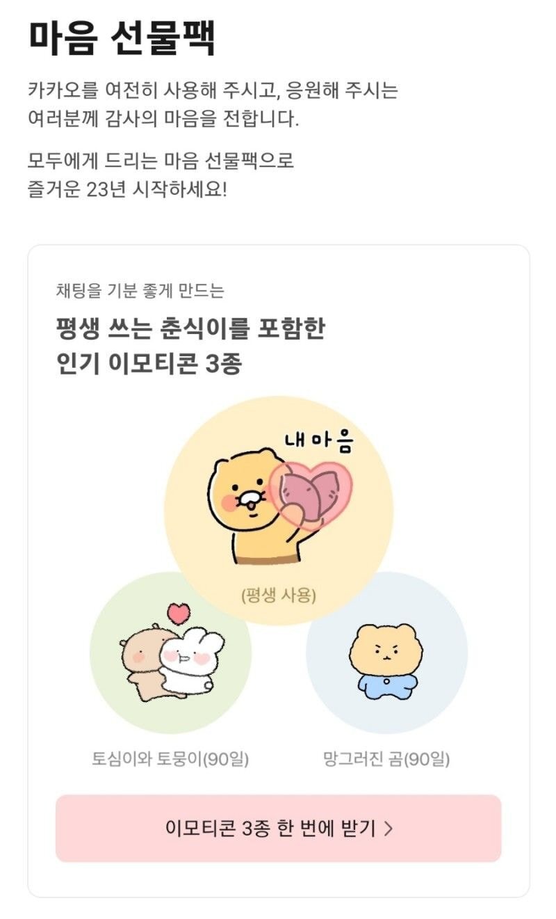이모티콘은 메시지로 오는 게 아니고 채팅방 아무 데나 들어가서 이모티콘 보내기 > 빨간 점 뜨는 이모티콘 다운로드