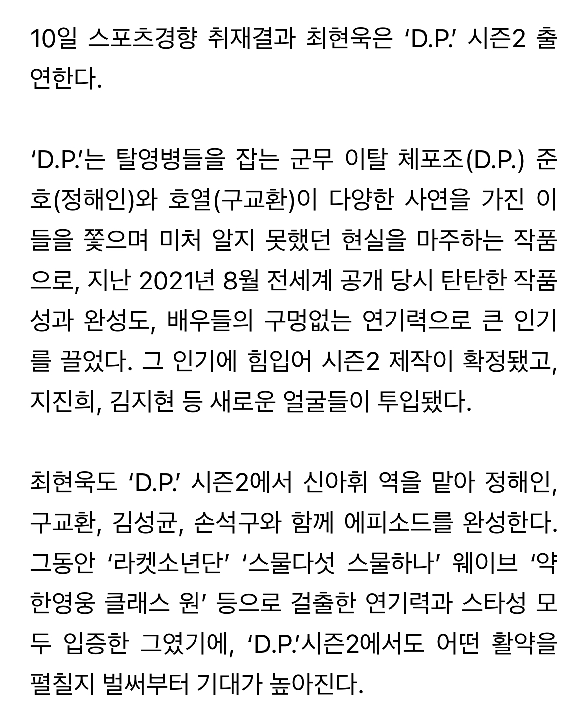 [연예][단독] 최현욱, ‘D.P.’ 시즌2 출연…‘대세 행보’ 작성자scenario|작성시간23.01.10|조회수7,034 목록 댓글 14 글자크기 작게가 글자크기 크게가 https://v.daum.net/v/20230110140531795 다음검색 현재 게시글 추가 기능 열기 북마크 공유하기 신고 센터로 신고 댓글 댓글 14 댓글쓰기 답글쓰기 댓글 리스트 작성자오바람 | 작성시간 23.01.10 으아 작성자Kiss of Fire | 작성시간 23.01.10 오 작성자윤재혁 | 작성시간 23.01.10 꺅 작성자시작 | 작성시간 23.01.10 오 작성자도경수인디오 | 작성시간 23.01.17 잘생김 !! 댓글 전체보기