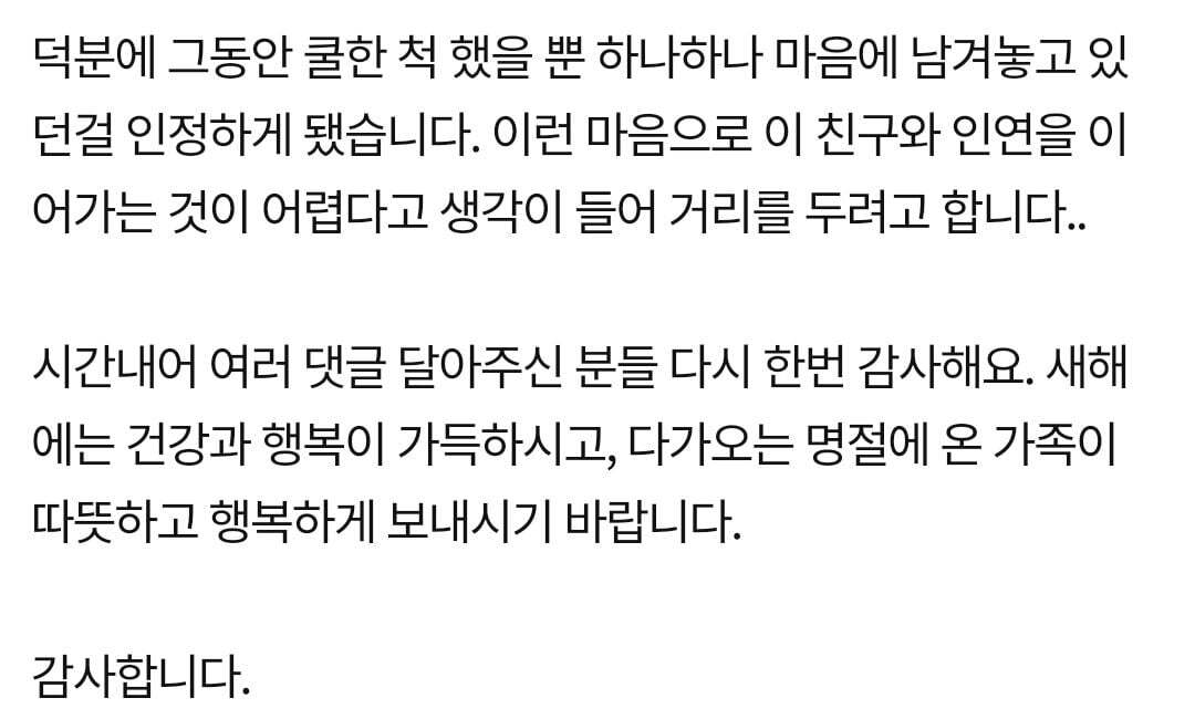 배려랍시고 서운한거 마음속에 담아두고 혼자 꿍해있다가 손절치는게 더 이해안가 -