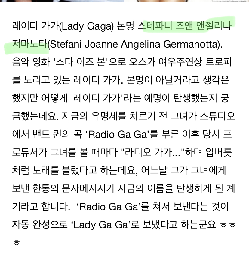 [기타]레이디 가가 본명 알았다vs몰랐다 작성자Yunjin|작성시간23.01.25|조회수2,098 목록 댓글 5 글자크기 작게가 글자크기 크게가 ㅁㅂ문제 시 댓글! 다음검색 현재 게시글 추가 기능 열기 북마크 공유하기 신고 센터로 신고 댓글 댓글 5 댓글쓰기 답글쓰기 댓글 리스트 작성자히키고라니 | 작성시간 23.01.25 몰랐다 작성자NCT DREAM 이제노 | 작성시간 23.01.25 에이.. 비… 씨… 테파니 조앤 앤젤리나 저마노타 작성자박명수차장 | 작성시간 23.01.25 싸브레? 답댓글 작성자끌레도르 | 작성시간 23.01.25 시발 미쳤나 ㅠㅠㅠㅠ 회사에서 개터짐 작성자라떼라떼 | 작성시간 23.01.25 몰랏다 댓글 전체보기