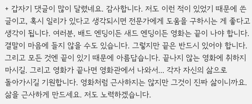 [기타]'가능성이 있는 상태'에 중독될수가 있음 (물어보살 10년째 무명 배우에 달린 댓글) 작성자someday|작성시간23.01.27|조회수933 목록 댓글 1 글자크기 작게가 글자크기 크게가 ㅊㅊㄷㅋ+) 추가로 달린 댓글https://youtu.be/gYErpoXUOQE이런 댓글도 있어서 추가해봄.. 다음검색 현재 게시글 추가 기능 열기 북마크 공유하기 신고 센터로 신고 댓글 댓글 1 댓글쓰기 답글쓰기 댓글 리스트 작성자사랑이란말이어울리는사람 | 작성시간 23.01.28 어후 찔리네그치만 뒤에 다시 달린 댓글 좋다 댓글 전체보기
