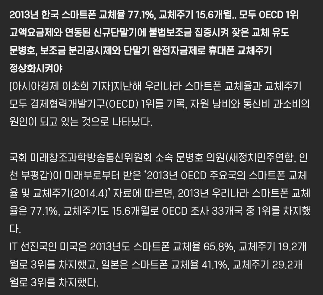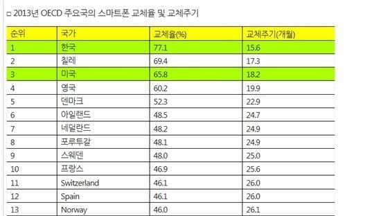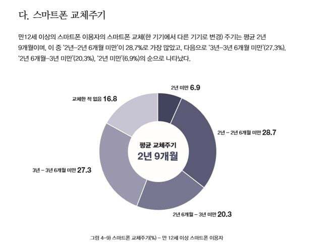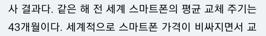 [기타]주요 연도별 스마트폰 교체주기 (국내기준) 작성자someday|작성시간23.02.07|조회수1,404 목록 댓글 3 글자크기 작게가 글자크기 크게가 ㅊㅊㄷㅋ 2013년 기준 한국 15.6개월1년 조금 넘기는 수준당시 세계에서 한국이 제일 빨리 스마트폰을 자주 바꾼다는 기사2017년 기준 한국 2년 7개월2018년 기준 한국 2년 9개월한국인터넷진흥원 조사1년 사이 교체주기 약 2개월 증가22년 기준 글로벌 교체주기 43개월 (3년 7개월)18년기준 2년 9개월이였고 매년 1~2개월씩 증가했던걸 보아, 국내도 글로벌 교체주기랑 크게 차이나진 않을듯 다음검색 현재 게시글 추가 기능 열기 북마크 공유하기 신고 센터로 신고 댓글 댓글 3 댓글쓰기 답글쓰기 댓글 리스트 작성자백현Ol | 작성시간 23.02.07 나도 글로벌 평균 정도 되네,,3년 넘었으니근데 이제 액정 나가서 바꿔야됨ㅜ 작성자행운아어서와 | 작성시간 23.02.07 핸드폰 고장만 안나면 잘써서 액정 이런거만 안나가면 더 오래쓰는거 같긴해 난 5년차라서,, 작성자갸도영 | 작성시간 23.02.07 나도 41개월 쓰고 이번에 바꿀 예정 진짜 갈수록 바꿀 이유가 없어 디자인도 비슷하고 성능도 그렇고! 댓글 전체보기