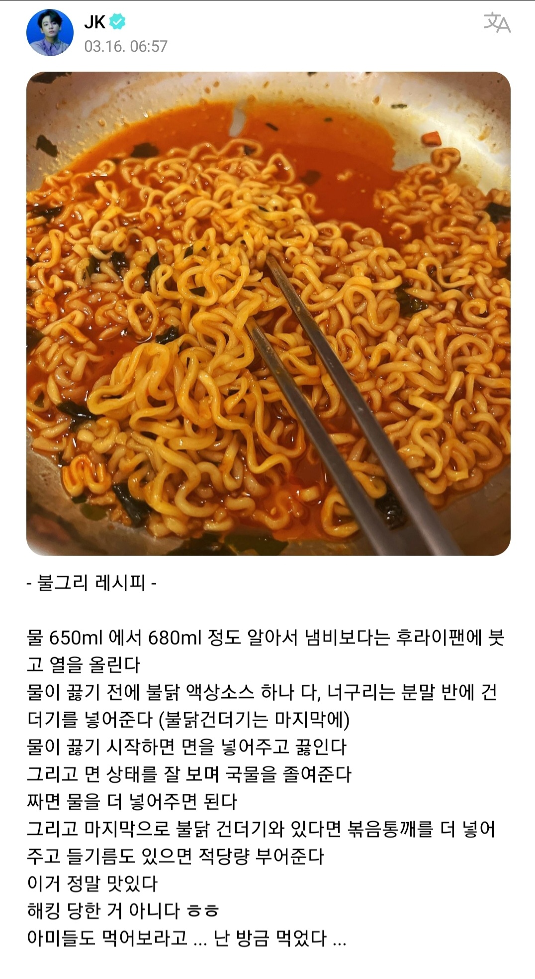 불닭볶음면을 지난주 첨 먹은 저에겐 불닭한개먹은것보담 덜 매움ㅎㅎ