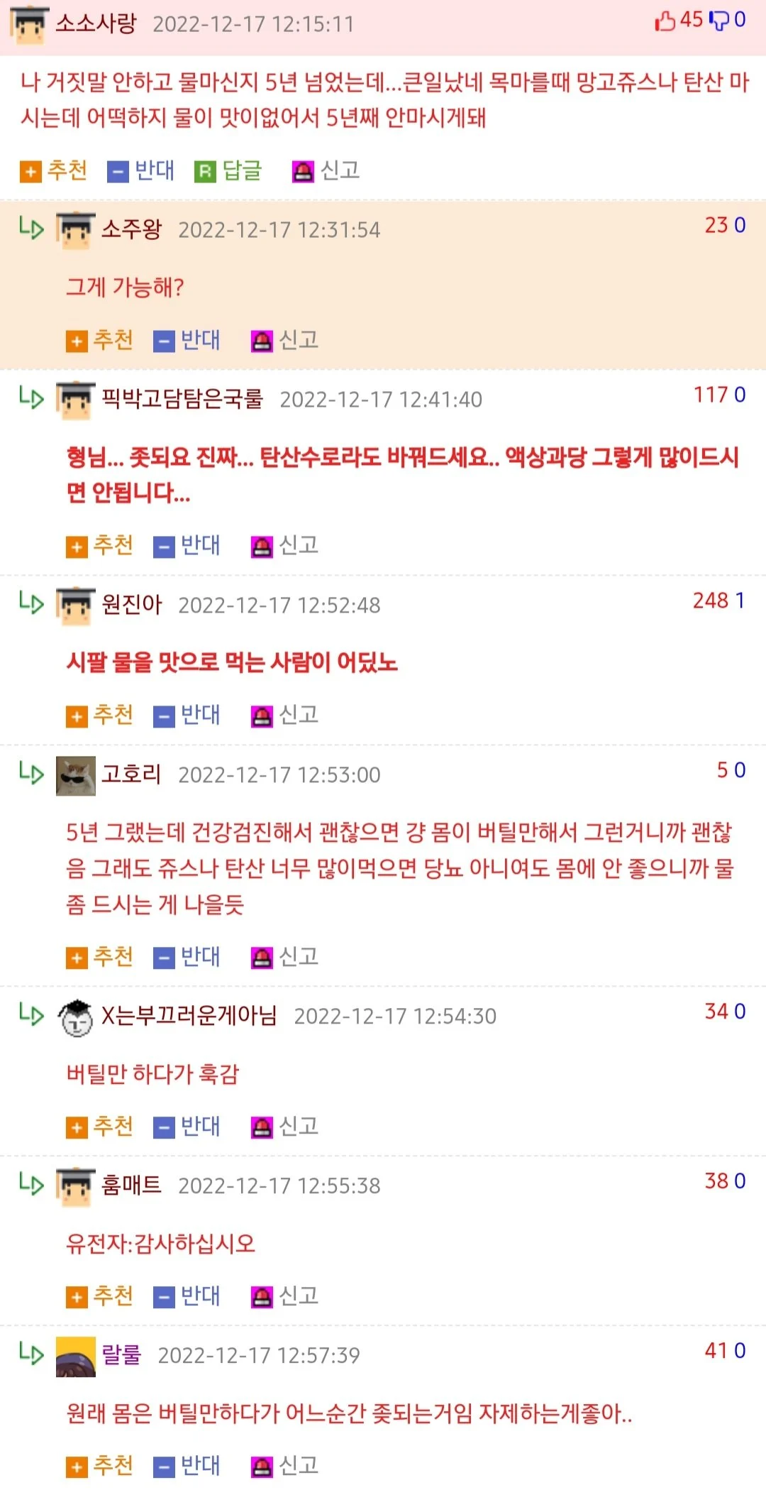 [기타]5년째 물 안마셨다는 사람 작성자someday|작성시간23.04.16|조회수2,485 목록 댓글 12 글자크기 작게가 글자크기 크게가 다음검색 현재 게시글 추가 기능 열기 북마크 공유하기 신고 센터로 신고 댓글 댓글 12 댓글쓰기 답글쓰기 댓글 리스트 작성자XIUMIN | 작성시간 23.04.16 나 맛으로 먹는데 하도 내가 비린맛을 찾아내서 그냥 보리차 끓여먹음 작성자깜장콩참새 | 작성시간 23.04.16 음료만 마시면 갈증안나나.. 작성자mooon_ | 작성시간 23.04.16 차라도 먹으세요 진짜 당뇨 올듯 작성자재규어와 강아지 | 작성시간 23.04.16 그러다 죽어요 작성자패스파인더 | 작성시간 23.04.16 나도 맹물 안좋아해보리차티백 강추 댓글 전체보기
