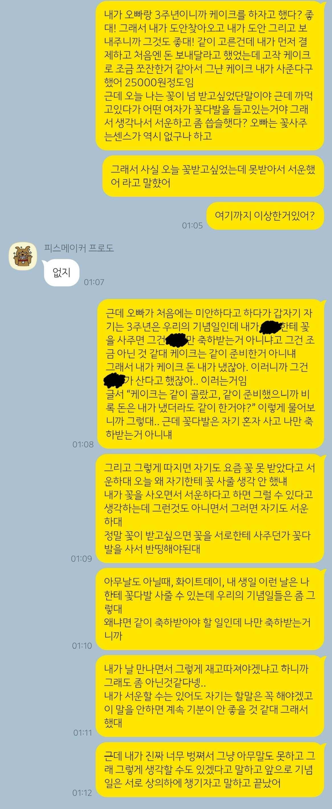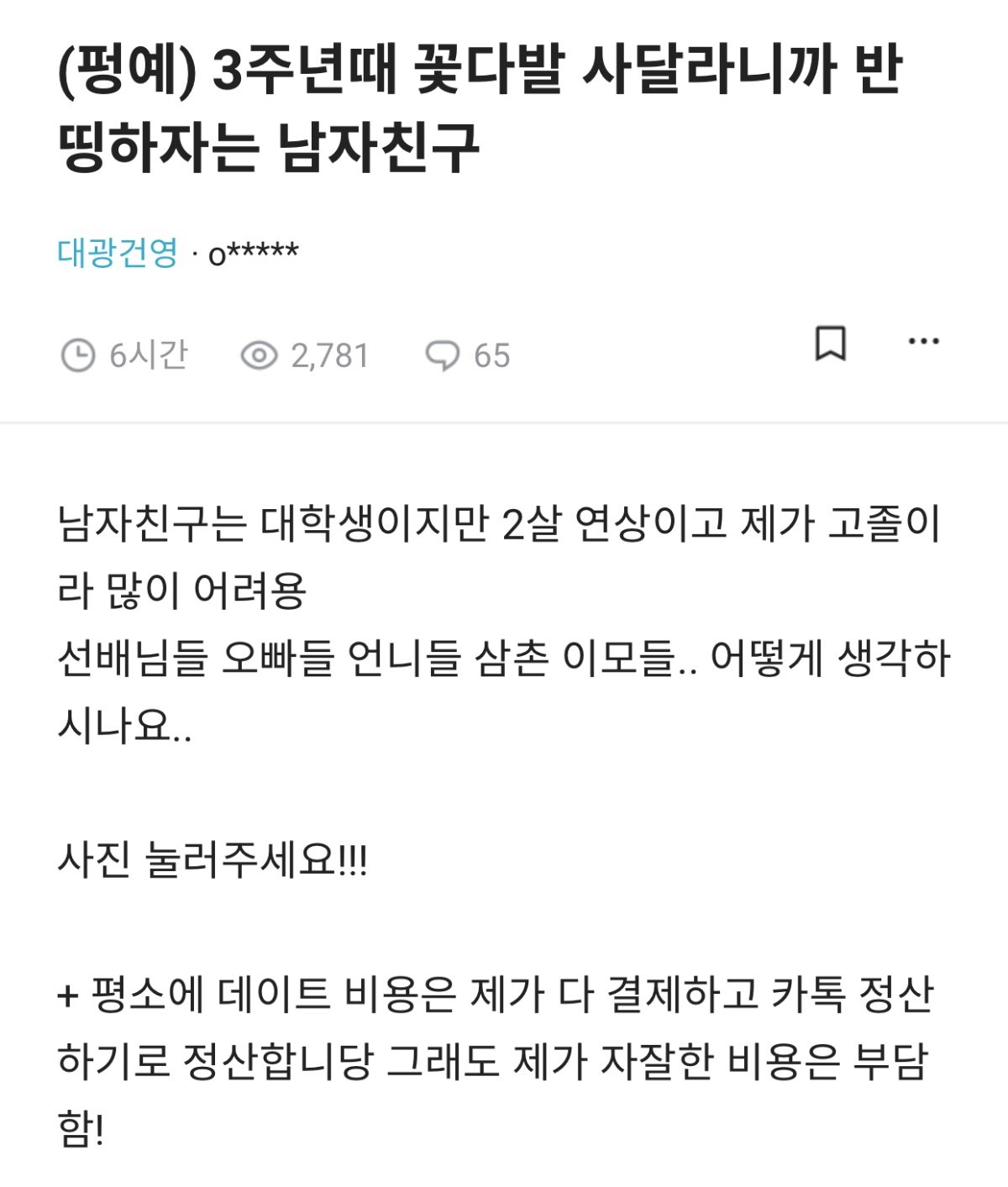 [기타]3주년때 꽃다발 사달라니까 반띵하자는 남자친구 작성자someday|작성시간23.04.16|조회수2,144 목록 댓글 20 글자크기 작게가 글자크기 크게가 ㅊㅊㄷㅋ 다음검색 현재 게시글 추가 기능 열기 북마크 공유하기 신고 센터로 신고 댓글 댓글 20 댓글쓰기 답글쓰기 댓글 리스트 작성자류체리 | 작성시간 23.04.16 .... 작성자재규어와 강아지 | 작성시간 23.04.16 헤어져 작성자blueberri | 작성시간 23.04.16 왜 사겨..? 작성자첫봄 | 작성시간 23.04.16 결혼해 작성자두유럽미 | 작성시간 23.04.16 카톡 정산........ 댓글 전체보기