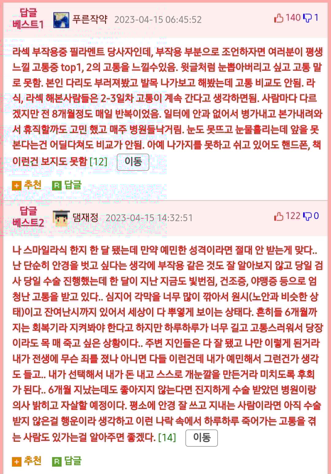 작성자말랑아기댕댕 작성시간 23.04.16 헐 ..... 난 했느데 건조증 개심하고 시력 다시 좀 나빠짐 .. 그래도 안경 벗은게 편해서 좋앗는데 저렇게 부작용 심할수도 있구나 ..
