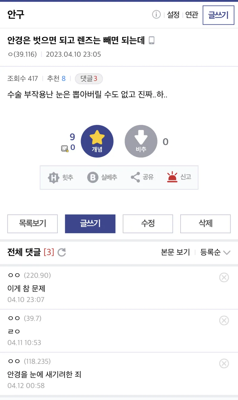 작성자NCT도재정 작성시간 23.04.16 라섹 3년차 약간의 시력 감소 말고는 아직 부작용 전혀 없어서 만족은 한다만 신중해야 하는 수술인 건 확실한 듯