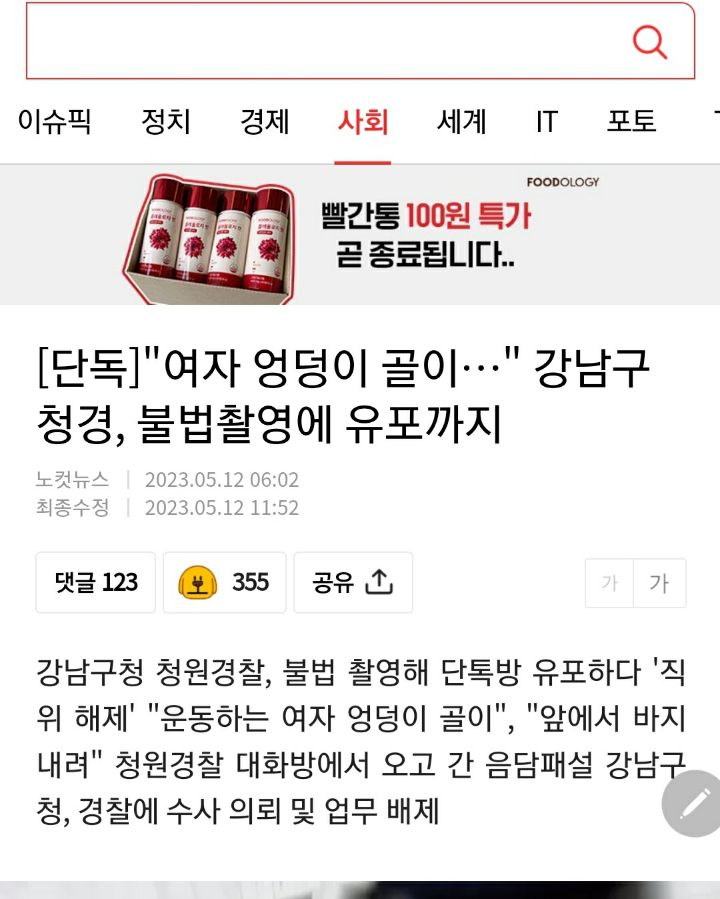 [사회][단독]"여자 엉덩이 골이…" 강남구 청경, 불법촬영에 유포까지 작성자스르릉.|작성시간23.05.12|조회수331 목록 댓글 2 글자크기 작게가 글자크기 크게가 https://m.news.nate.com/view/20230512n02435[단독]"여자 엉덩이 골이…" 강남구 청경, 불법촬영에 유포까지 | 사회 : 네이트 뉴스사회 뉴스: 구청 청사를 지키는 데 앞장서야 할 청원경찰이 여성의 신체를 불법 촬영하고 이를 버젓이 유포한 사실이 뒤늦게 드러나 직위 해제됐다. 최근 직장인 익명 커뮤니티 '블라인드'에 서m.news.nate.com 다음검색 현재 게시글 추가 기능 열기 북마크 공유하기 신고 센터로 신고 댓글 댓글 2 댓글쓰기 답글쓰기 댓글 리스트 작성자아카비 | 작성시간 23.05.12 미친놈 작성자레드벨벳 wendy | 작성시간 23.05.12 아니 업무 배제고 뭐고 잘라야하는 거 아냐? 댓글 전체보기