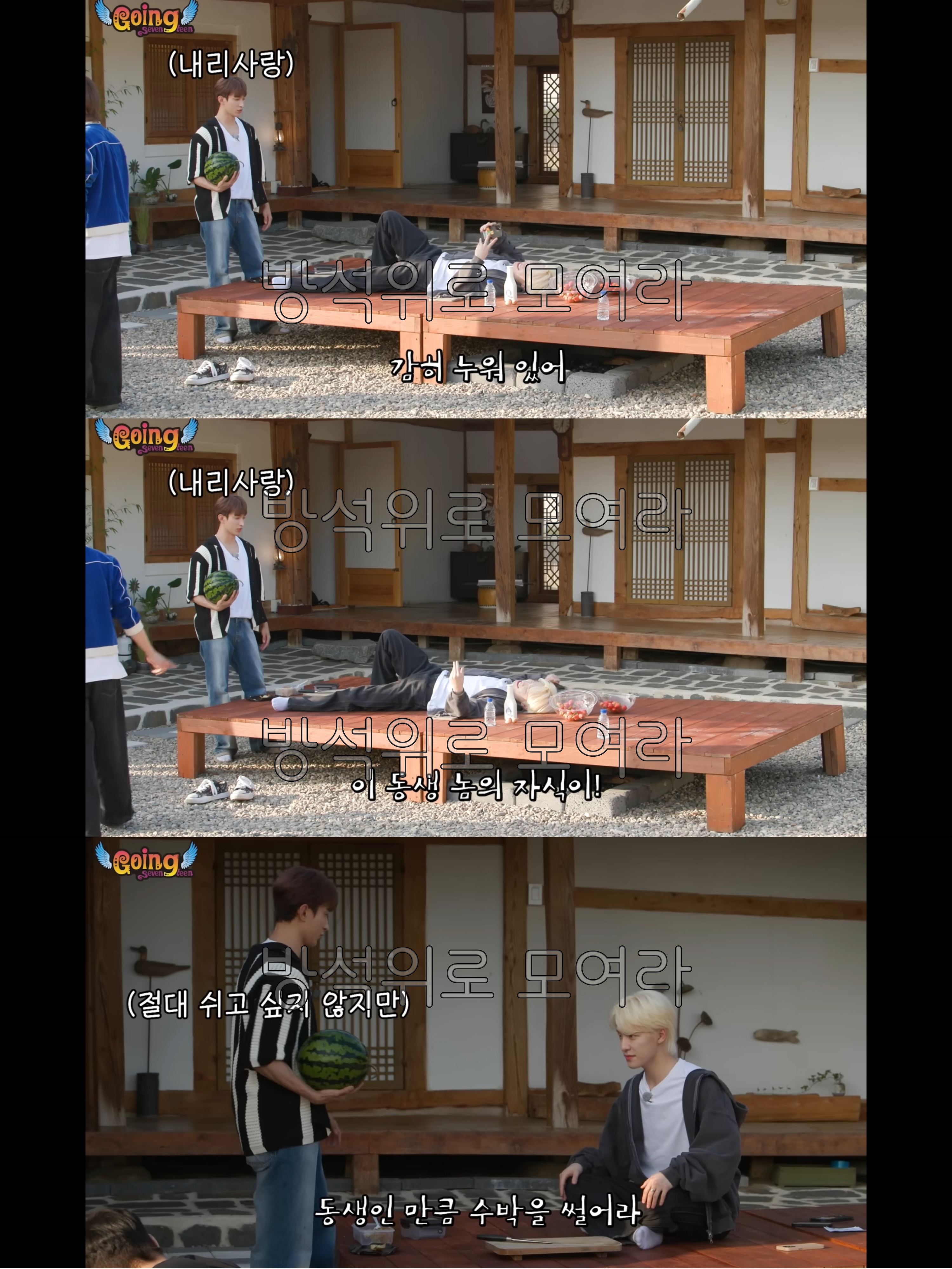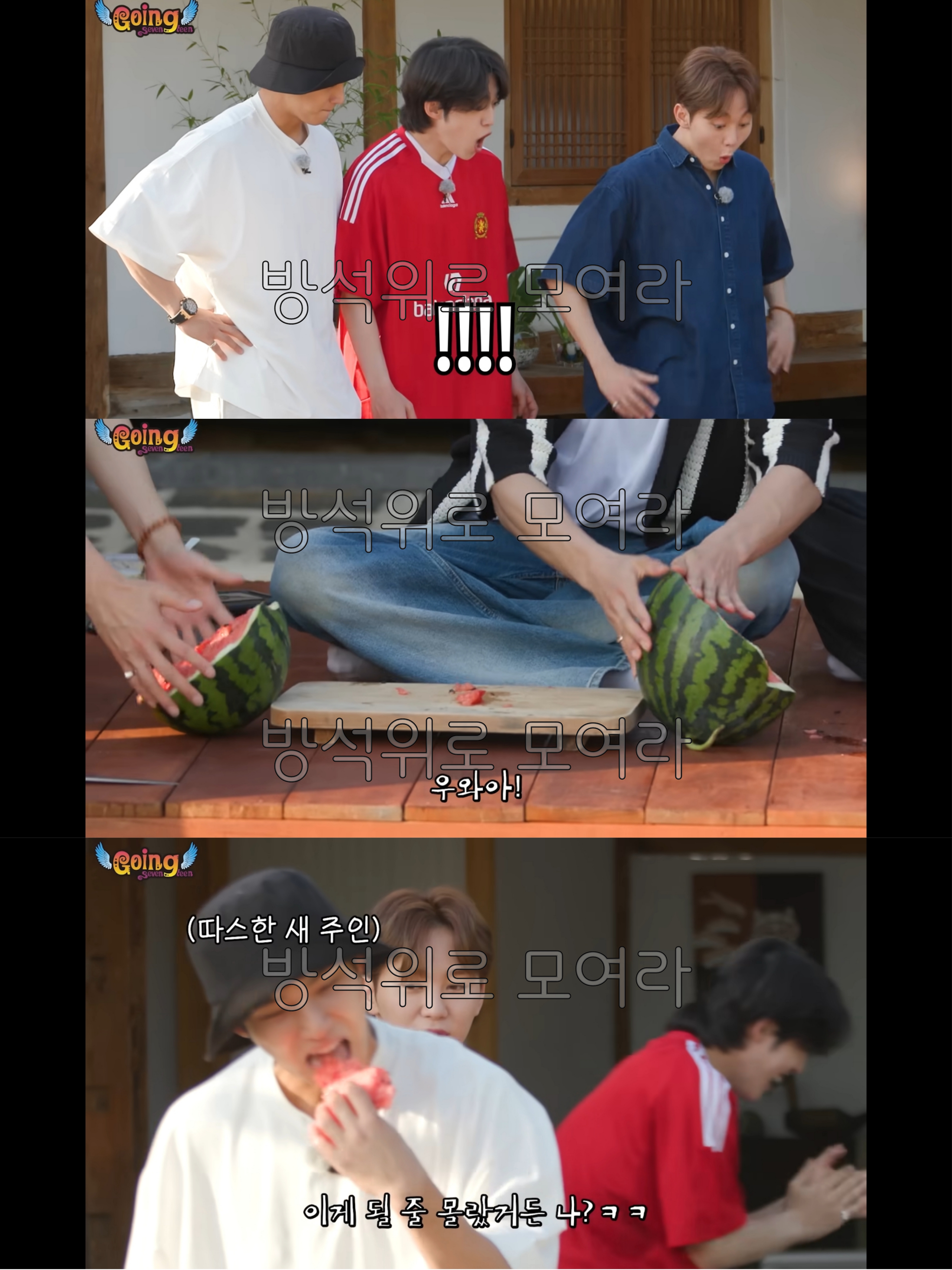 형 구워삶아서 맨손으로 수박깨게 만드는데 성공한 디노. 맨손으로 수박 깨던 멤버의 기를 받아서..
