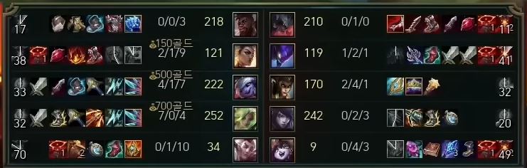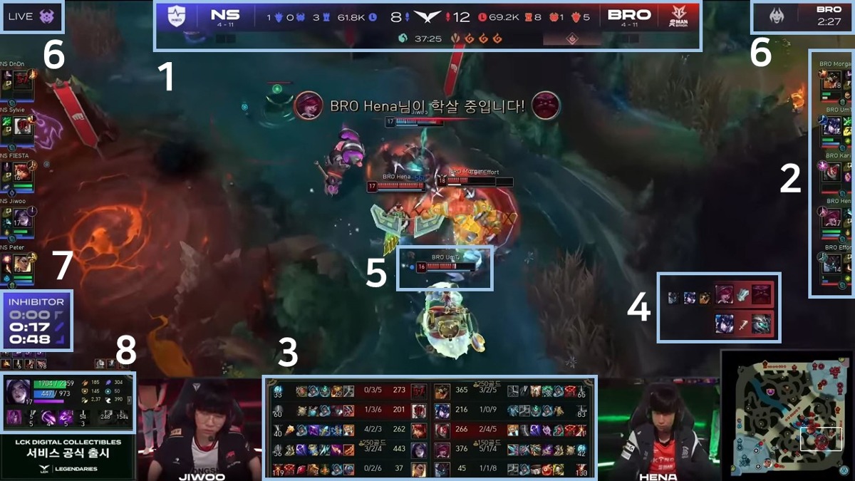 초상화 옆의 숫자가 CS, 그 옆은 KDA, KDA 위에는 현상금이 떠있고 그 옆에는 각 챔프들이 가지고있는 아이템(효과에 쿨타임이 있는것들은 시계처럼 쿨타임이 도는게 보이지?) 가장 바깥쪽에는 시야와 관련된 아이템들이 떠있어.