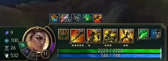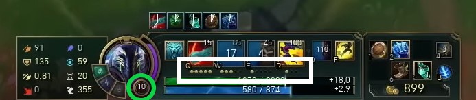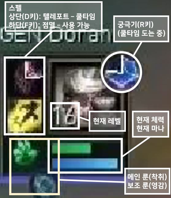 밑줄에는 챔피언의 스킬들이 몇레벨인지, 쿨타임이 몇초 남았는지 알려주고, 그옆엔 스펠의 상태를 보여줘.