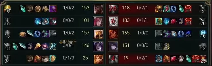 이곳에선 각 챔피언들의 생사여부, CS, KDA, 현상금의 유무, 보유중인 아이템, 보유중인 와드류 아이템들을 알 수 있어.