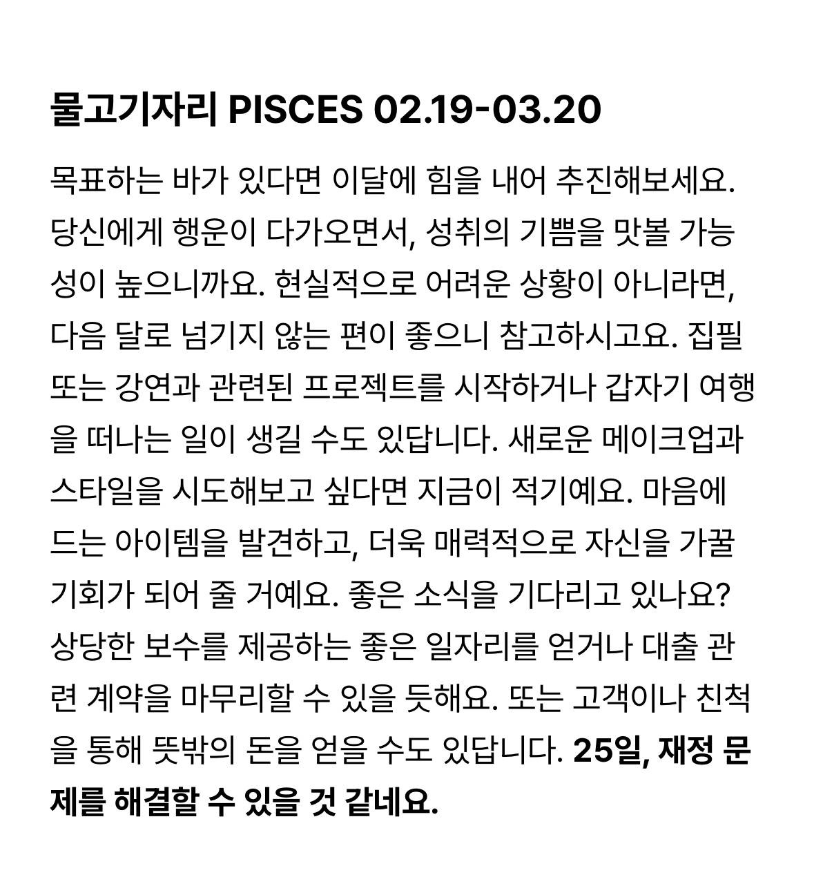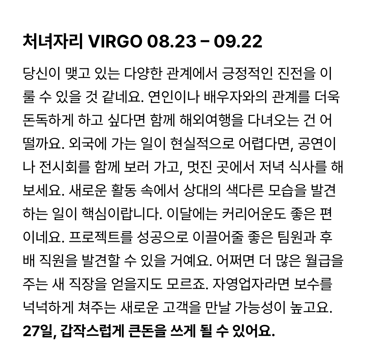 [기타]W KOREA 3월 별자리 운세 작성자라브|작성시간24.03.01|조회수1,686 목록 댓글 75 글자크기 작게가 글자크기 크게가 다음검색 현재 게시글 추가 기능 열기 북마크 공유하기 신고 센터로 신고 댓글 댓글 75 댓글쓰기 답글쓰기 댓글 리스트 작성자Hap합 | 작성시간 24.03.02 복채 작성자청바지마가레뜨 | 작성시간 24.03.02 복채 작성자예뻐 보여 | 작성시간 24.03.02 복채 작성자유가을 | 작성시간 24.03.02 복채 작성자결혼해줄꺼아님 웃지마 | 작성시간 24.03.03 복채 댓글 전체보기