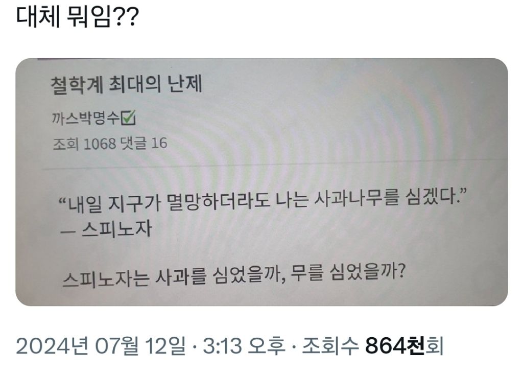 [유머]<내일 지구가 멸망하더라도 나는 사과나무를 심겠다/스피노자> 그렇다면 스피노자는 사과를 심었을까, 무를 심었을까? 작성자베어곰|작성시간24.07.13|조회수950 목록 댓글 3 글자크기 작게가 글자크기 크게가 1. 사과2. 무3. 기타 다음검색 현재 게시글 추가 기능 열기 북마크 공유하기 신고 센터로 신고 댓글 댓글 3 댓글쓰기 답글쓰기 댓글 리스트 작성자하느 | 작성시간 24.07.13 3. 지구 멸망 안 했으니 암것도 안 심었다 작성자정은우 | 작성시간 24.07.13 🎸 작성자재찬 | 작성시간 24.07.14 개어이없어ㅜ 댓글 전체보기
