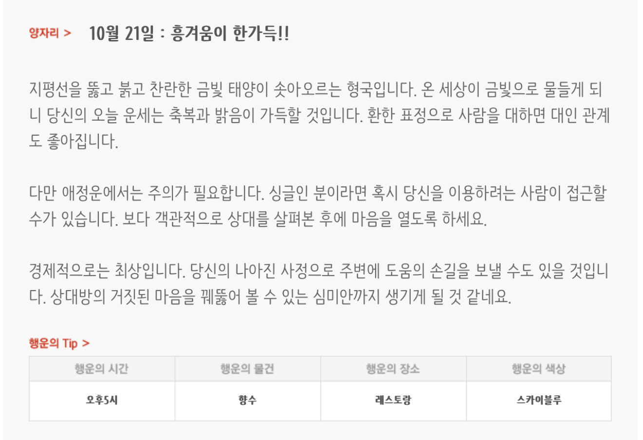 [기타]하루전에 미리보는 10월 21일 별자리운세 작성자앰퍼샌드원|작성시간24.10.20|조회수755 목록 댓글 38 글자크기 작게가 글자크기 크게가 출처 : 산수도인 다음검색 현재 게시글 추가 기능 열기 북마크 공유하기 신고 센터로 신고 댓글 댓글 38 댓글쓰기 답글쓰기 댓글 리스트 작성자네이버관리자 | 작성시간 24.10.21 복채 작성자오늘밤 눈이 내리면 | 작성시간 24.10.21 복채 작성자정아지 | 작성시간 24.10.21 복채 작성자nct dream RENJUN | 작성시간 24.10.21 복채 작성자짜릿햐 | 작성시간 24.10.21 복채 댓글 전체보기