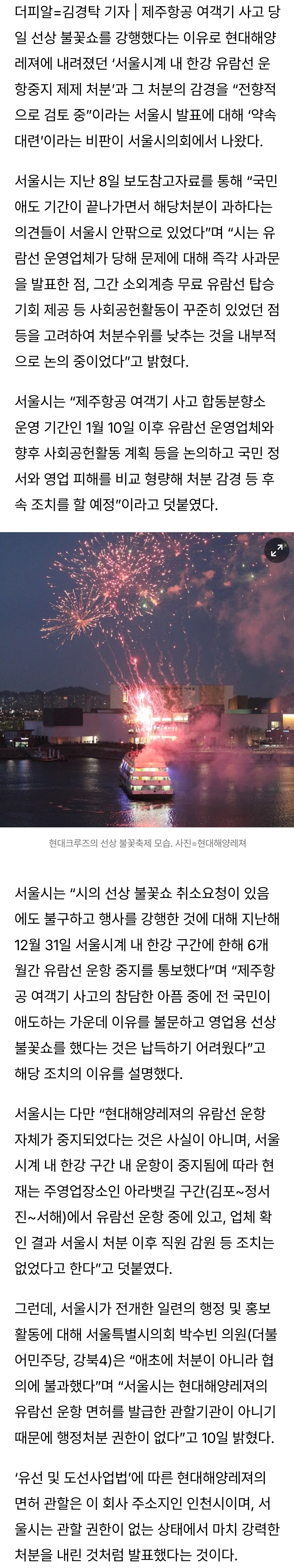 [분노/혐오]서울시 한강유람선 운항중지, ‘눈속임’이었다 작성자내 기억의 주인은 나야|작성시간25.01.10|조회수364 목록 댓글 2 글자크기 작게가 글자크기 크게가 출처https://www.the-pr.co.kr/news/articleView.html?idxno=52822서울시 한강유람선 운항중지, ‘눈속임’이었다더피알=김경탁 기자 | 제주항공 여객기 사고 당일 선상 불꽃쇼를 강행했다는 이유로 현대해양레져에 내려졌던 ‘서울시계 내 한강 유람선 운항중지 제제 처분’과 그 처분의 감경을 “전향적으www.the-pr.co.kr 다음검색 현재 게시글 추가 기능 열기 북마크 공유하기 신고 센터로 신고 댓글 댓글 2 댓글쓰기 답글쓰기 댓글 리스트 작성자포도와인 | 작성시간 25.01.10 엥?????미쳤네 와 개어이없어.. 작성자설정값 | 작성시간 25.01.10 쇼만 하는 오세훈 ㅅㅂ 나는 쟤 안 뽑았다고ㅠㅠㅠ 댓글 전체보기