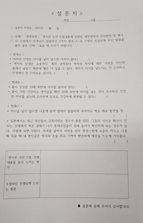 설문지는 “‘생식과 유전’ 수업내용에 관련된 세부항목의 진위판단 및 평가”라며 “해당 수업에서 선생님이 말씀하신 3가지 항목 A, B, C에서 진실되게 하신 말씀을 골라 괄호 안에 ○표를 해주기 바란다”고 시작한다. 특히 설문지 상단에는 학생들의 학번과 이름을 기입하도록 돼 있다.