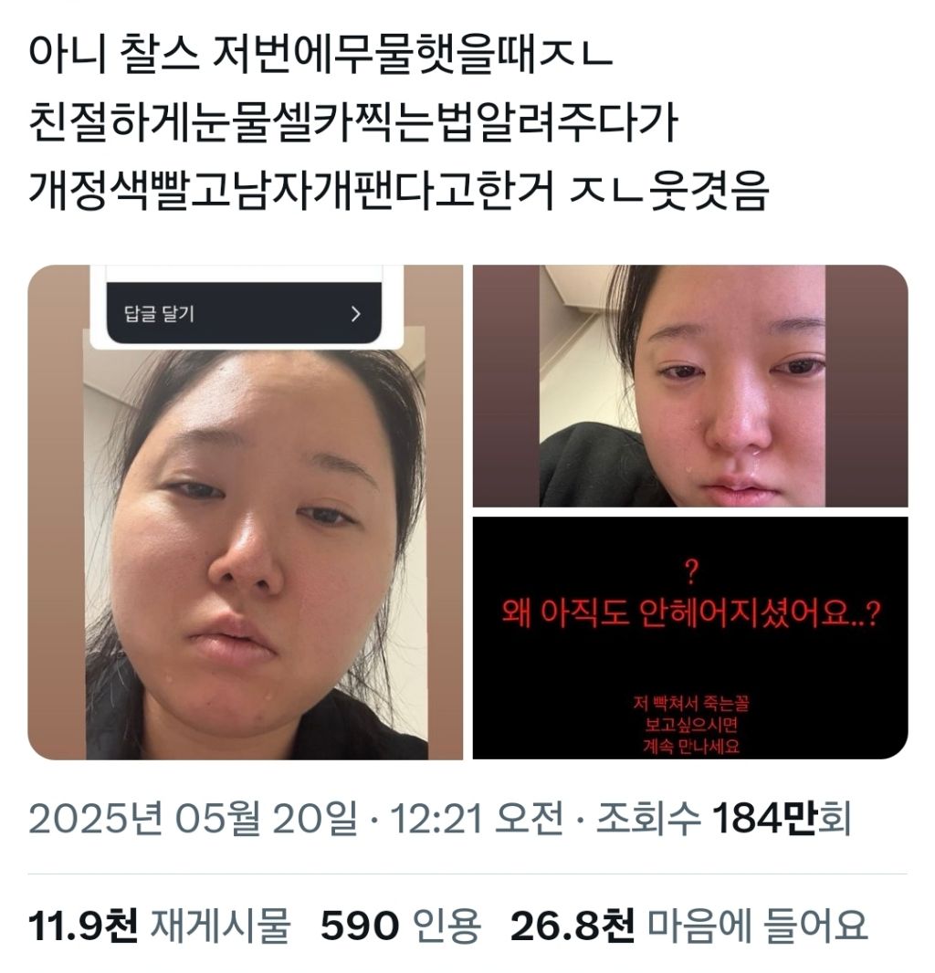 [유머]눈물셀카 찍는법 알려주다가 갑자기 남자 개패는 찰스엔터 ㅋㅋㅋㅋㅋ 작성자후리후리스|작성시간25.05.23|조회수2,027 목록 댓글 1 글자크기 작게가 글자크기 크게가 다음검색 현재 게시글 추가 기능 열기 북마크 공유하기 신고 센터로 신고 댓글 댓글 1 댓글쓰기 답글쓰기 댓글 리스트 작성자담넘천 | 작성시간 25.05.23 아니 진짜로 진림으로 ㄹㅇ 왜 안 헤어짐 댓글 전체보기