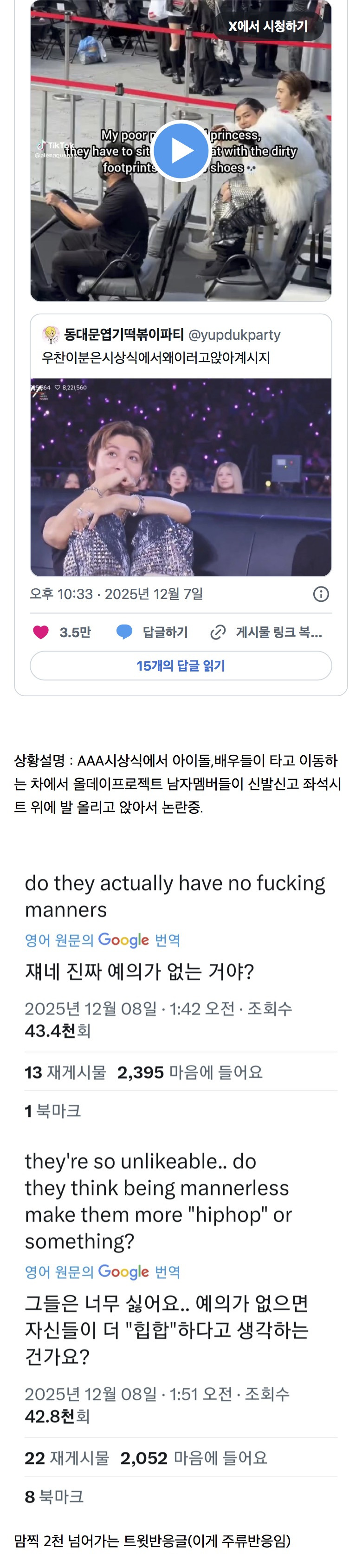 [연예]트위터에서 해외팬들 사이에서 예의 없다고 난리난 아이돌 작성자페일|작성시간25.12.08|조회수1,533 목록 댓글 5 글자크기 작게가 글자크기 크게가 출처 더쿠https://theqoo.net/square/4020449226https://x.com/mulmongz/status/1997660736944824423?t=6oc77UoEOLtrha36IJIkBA&s=19담캎 Html 막혀서 퍼오기가 안 됨.. 다음검색 현재 게시글 추가 기능 열기 북마크 공유하기 신고 센터로 신고 댓글 댓글 5 댓글쓰기 답글쓰기 댓글 리스트 작성자청람 | 작성시간 25.12.08 여긴.맨날 남멤들이.문제네.... 작성자View | 작성시간 25.12.08 …데잉 작성자LV.5김대영이 | 작성시간 25.12.08 다같이 앉는거에 발올리는거 진짜 예의없네.. 작성자호료성 | 작성시간 25.12.08 오... 작성자쟌소리 | 작성시간 25.12.08 생각이 너무 짧다 진짜 댓글 전체보기