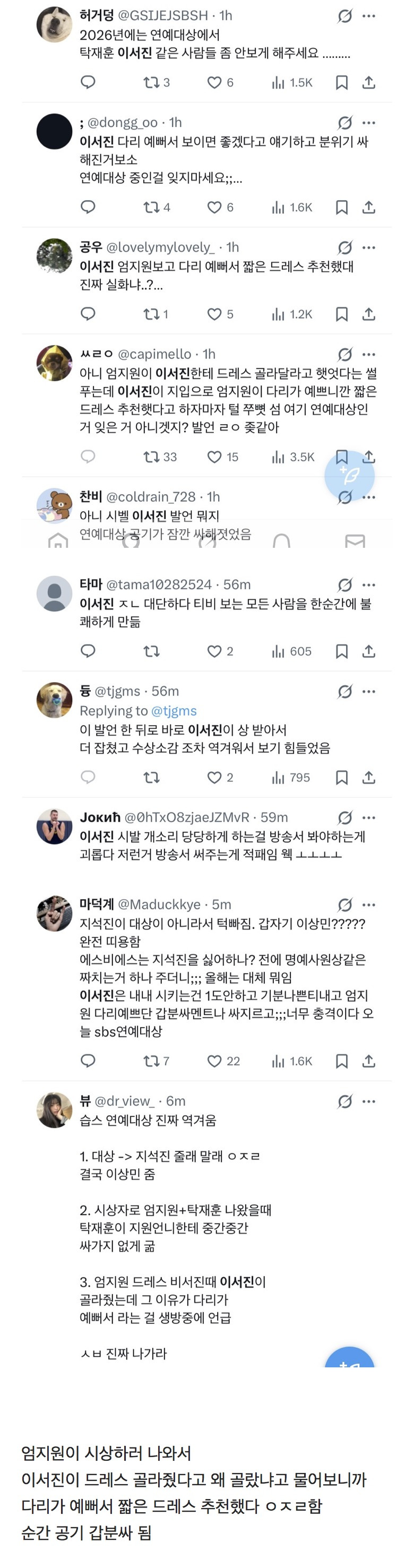 [연예]오늘자 SBS 연예대상 도중에 논란된 이서진 발언 작성자페일|작성시간25.12.31|조회수2,527 목록 댓글 10 글자크기 작게가 글자크기 크게가 출처 ㅇㅅ 다음검색 현재 게시글 추가 기능 열기 북마크 공유하기 신고 센터로 신고 댓글 댓글 10 댓글쓰기 답글쓰기 댓글 리스트 작성자NotToday | 작성시간 25.12.31 나이만 먹지말고 흐름도 좀 따라가라 주변에서 츤데레츤데레 해주니까 발전이없네 작성자지켜내 | 작성시간 25.12.31 개극혐임 작성자호료성 | 작성시간 25.12.31 엥 작성자Snowman | 작성시간 25.12.31 으 저 사람 저번에 뭐 논란 있지않았나 ;;; ㅁㅊ 작성자석류토마토 | 작성시간 25.12.31 논란이커지지않앗다니..아직멀엇다 댓글 전체보기