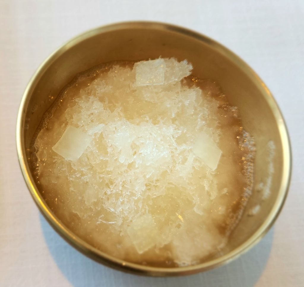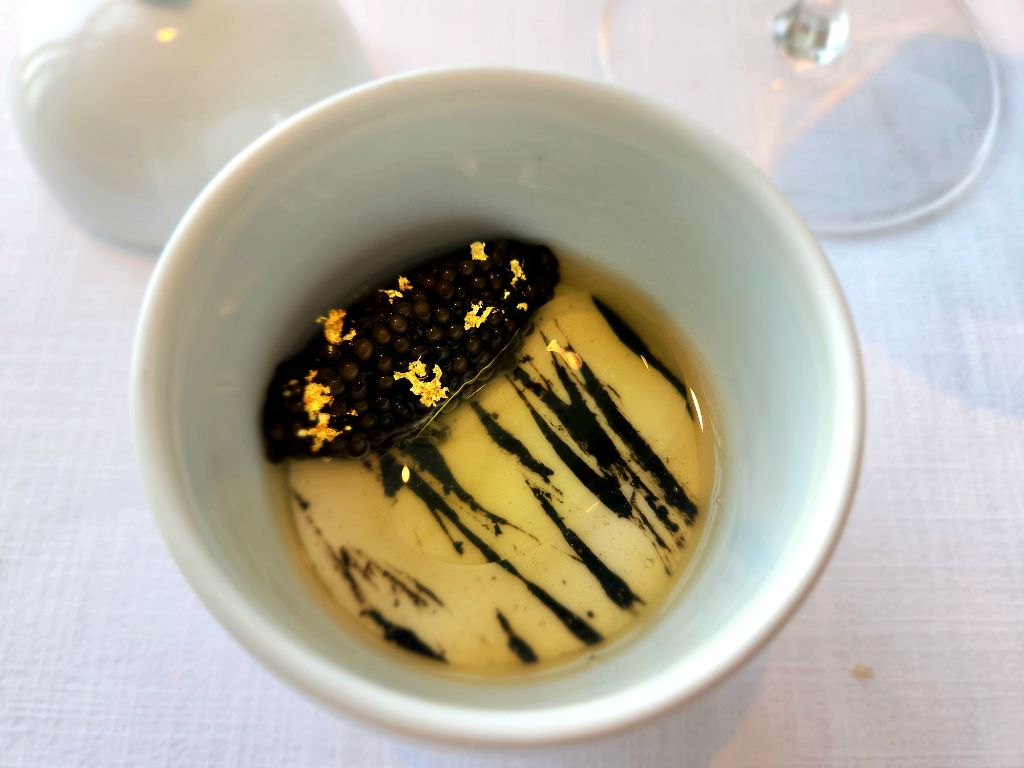 조개육수랑 봄동 위에 캐비어가 올라간 음식이야. 직원분께서 캐비어 좋아하시나요? 물으셨는데 내가 너무 솔직하게 "선호하진 않습니다." 해버렸음. 캐비어 추가로 더 얹어주시려고 캐비어 담긴 병을 열던 직원분의 눈에 잠시 동공지진이 일어났지만 프로답게 금새 진정하시고 캐비어를 더 얹어주셨음.