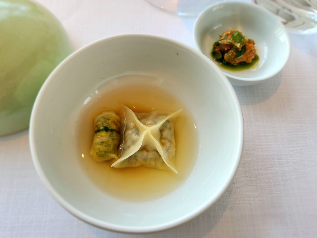 미나리 들어간 만두, 복어로 만든 식해. 식해가 새콤한 맛이 있어서 만두에 곁들여 먹기 좋더라.