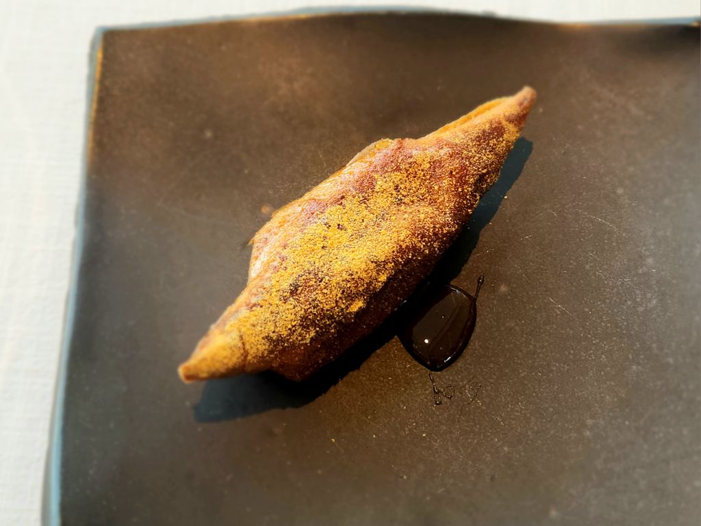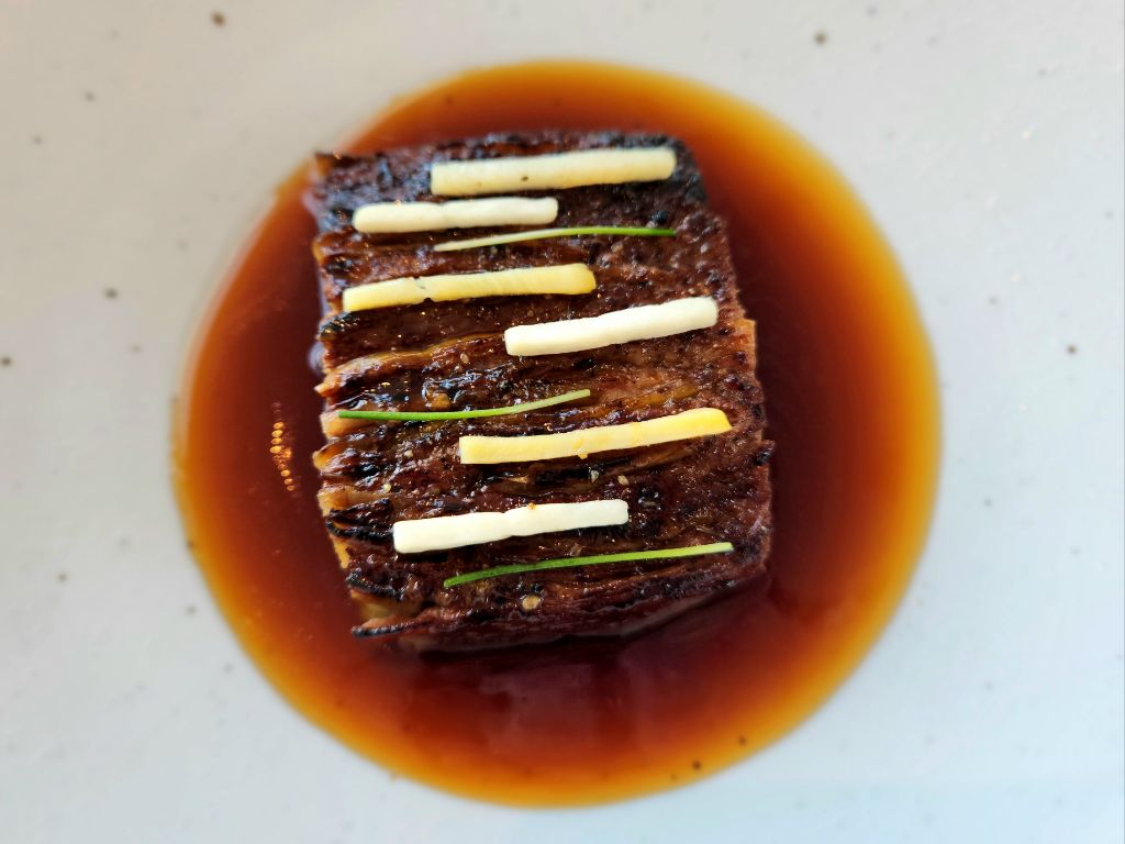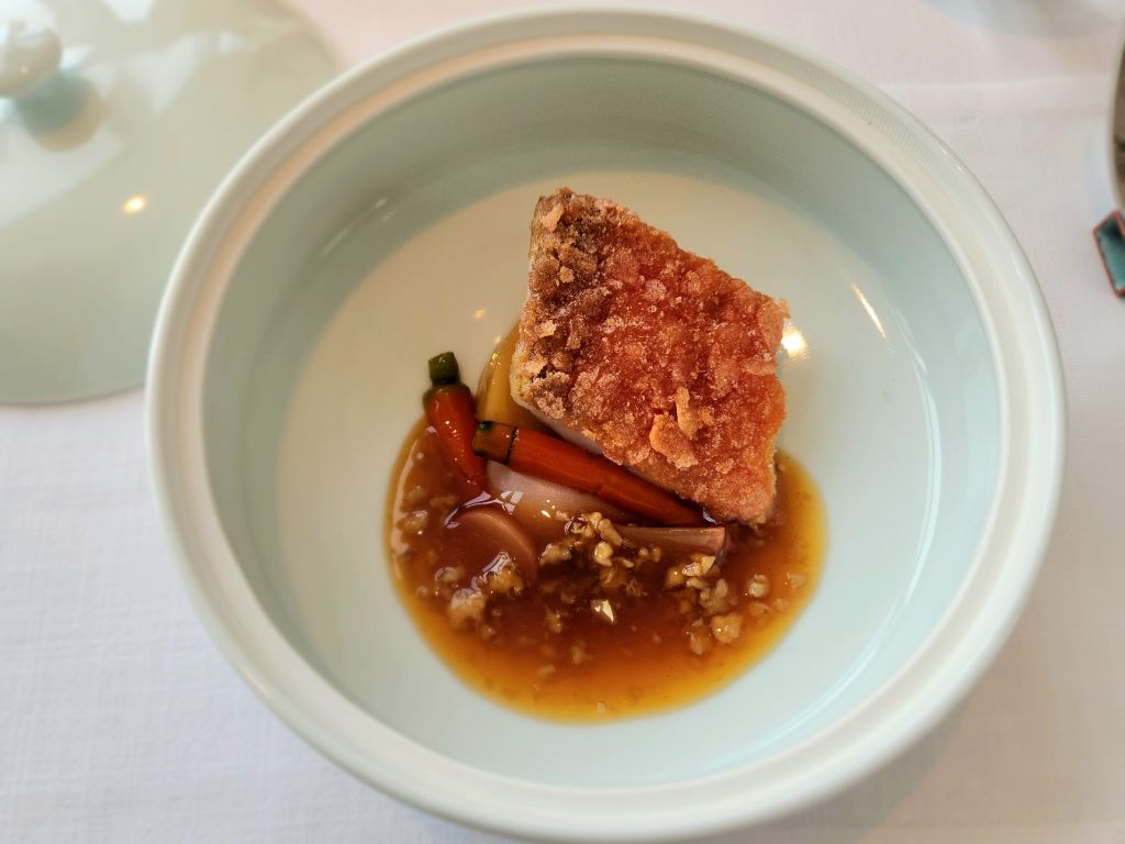 껍질이 바삭해서 너무 맛있었어. (껍질이 맛있었어. 살은 그냥 무난한 생선살) 가니쉬로 나온 당근, 무, 래디쉬(? 보라색 채소였는데 정체가 래디쉬가 맞는지 모르겠음.)가 살짝 달달한 맛이 나는 소스에 절여져있는데 당근도 그렇고 래디쉬도 그렇고 특유의 향이 있는 음식이잖아. 나 향이 강한 음식 안 좋아하는데 더덕도 그랬고 래디쉬도 그렇고 향이 그렇게 강하게 느껴지지 않아서 먹기 좋았어.