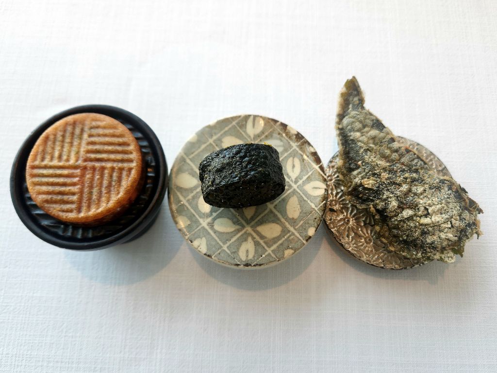 처음이 깻잎 단새우 부각인데 깻잎 안에 단새우랑 여러가지 재료들이 크림같은 소스에 버무려져 있었고 새콤한 맛이었어. 두번째가 캐비어가 감싸진 김부각(저스트 캐비어 맛), 세번째가 육회가 들어있는 감자부각인데 육회 좋아해서 그런지 내 입맛에는 부각 중 제일 맛있더라.