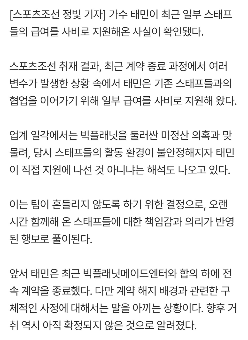 [기타][단독]샤이니 태민, 사비로 스태프 급여 지원…의리도 빛났다 작성자View|작성시간26.02.24|조회수3,641 목록 댓글 8 글자크기 작게가 글자크기 크게가 방석위로모여라 Viewhttps://naver.me/F1alF8Ib[단독]샤이니 태민, 사비로 스태프 급여 지원…의리도 빛났다여기를 눌러 링크를 확인하세요m.entertain.naver.com 다음검색 현재 게시글 추가 기능 열기 북마크 공유하기 신고 센터로 신고 댓글 댓글 8 댓글쓰기 답글쓰기 댓글 리스트 작성자stay for a night | 작성시간 26.02.24 급여는 진짜 중요한 문제인데ㅠㅠㅠ 작성자문즤로못 | 작성시간 26.02.24 ㅠ… 최대한 깔끔리 정리하고 좋게 마무리하기 위해 노력하는 것 같음…!! 대단하다 작성자물_웨이드 | 작성시간 26.02.24 우와.. 저러면 진짜 오래 일할 수 있지 작성자배아파 | 작성시간 26.02.25 빅플래닛이 어딘가 했더니 IN100 모회사구만 작성자BLACK PINK | 작성시간 08:39 new 헐.. 댓글 전체보기