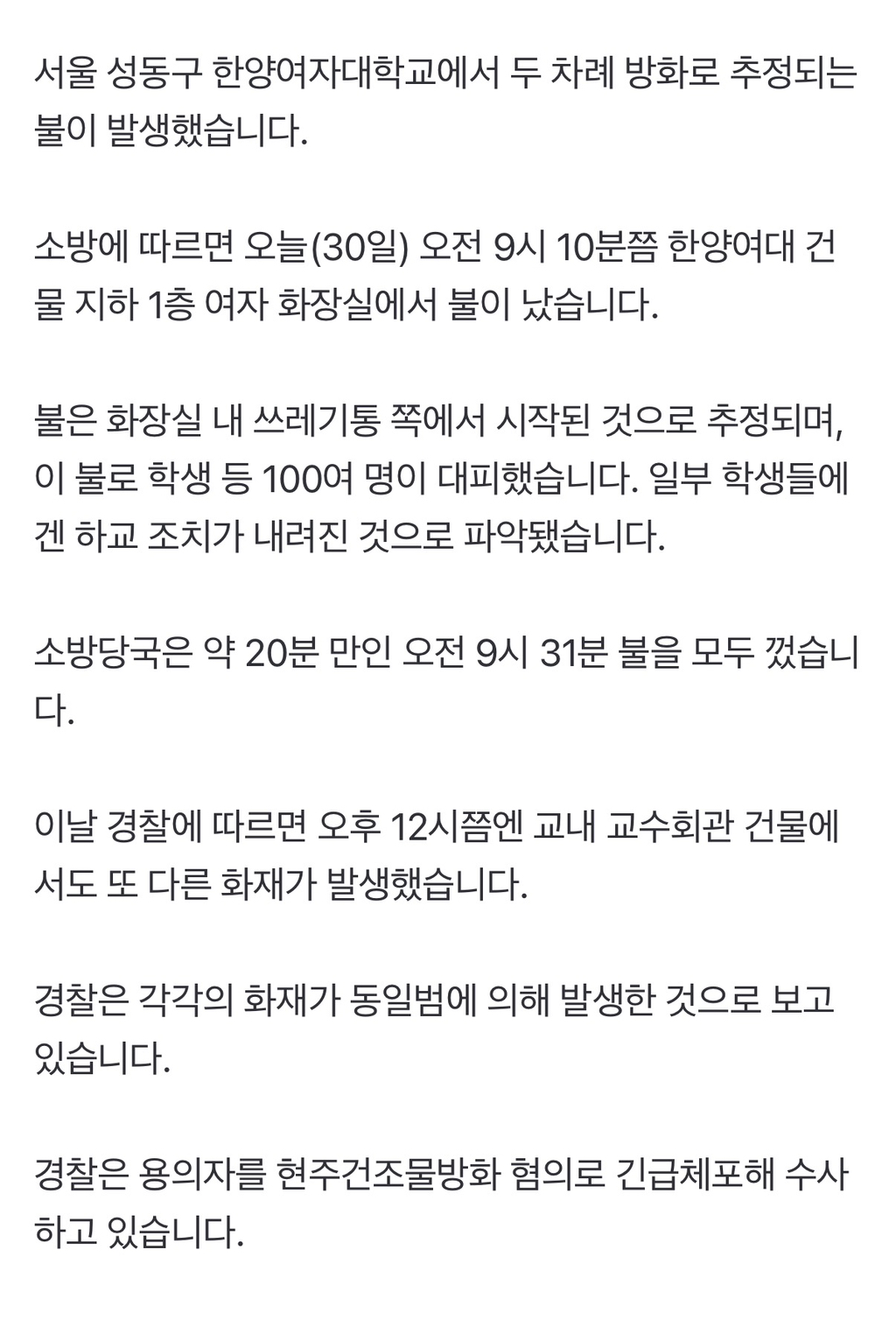 [사회][단독] 한양여대 두 차례 불로 100여 명 대피...방화 용의자 검거