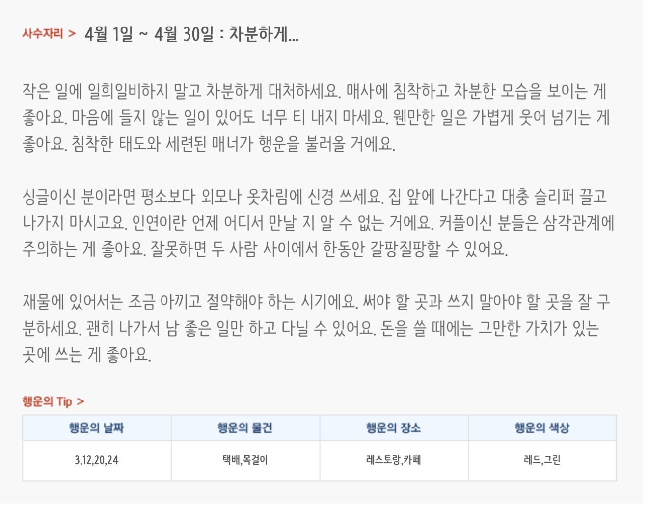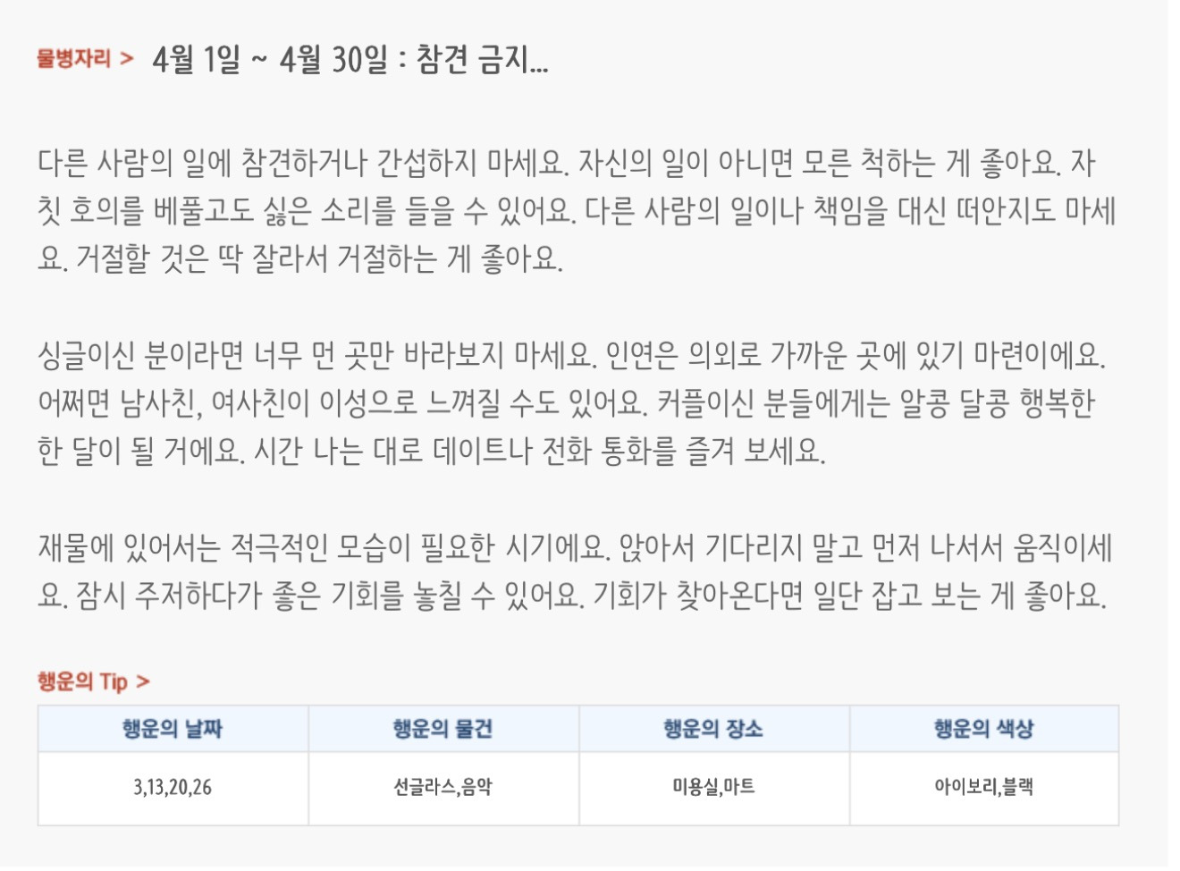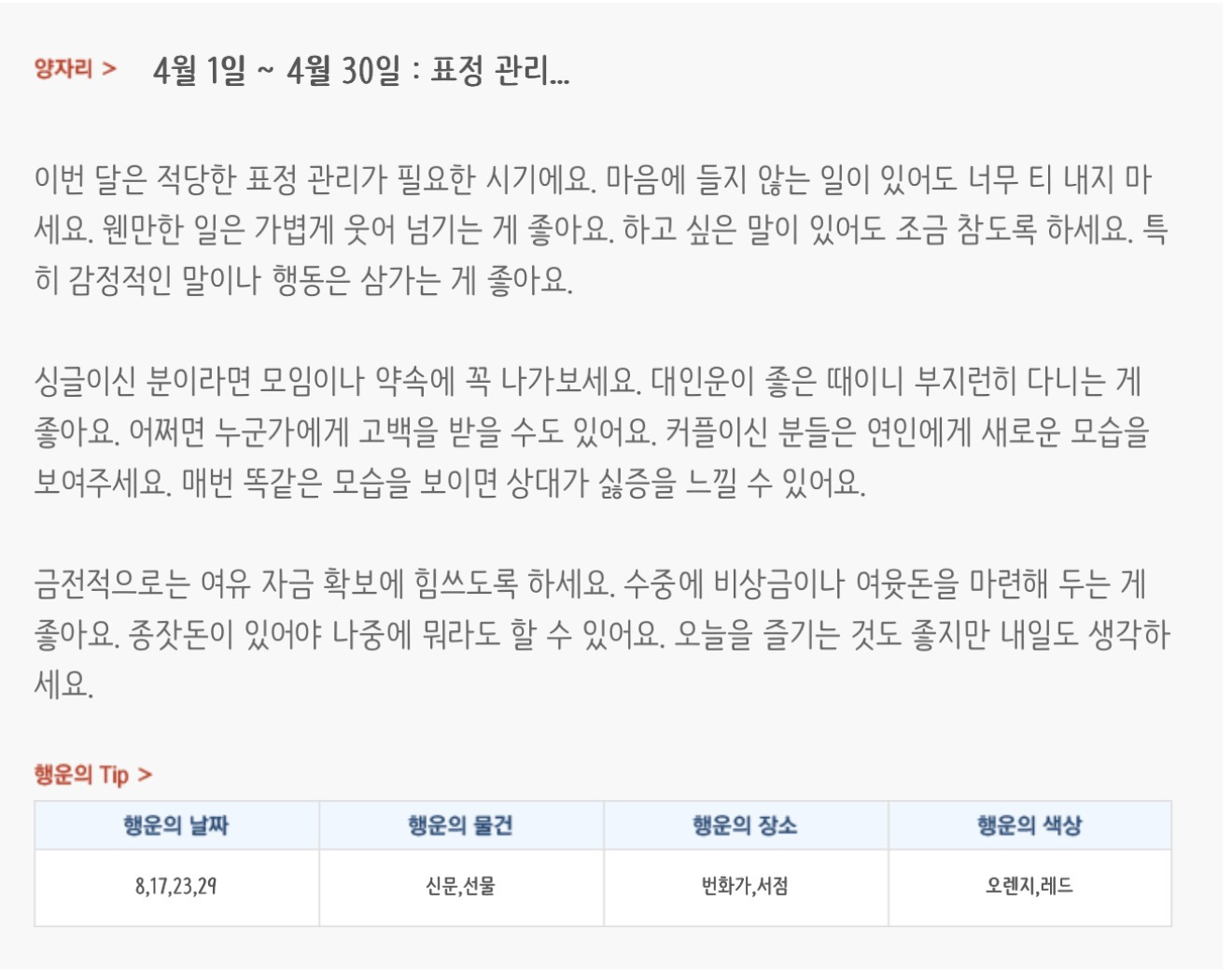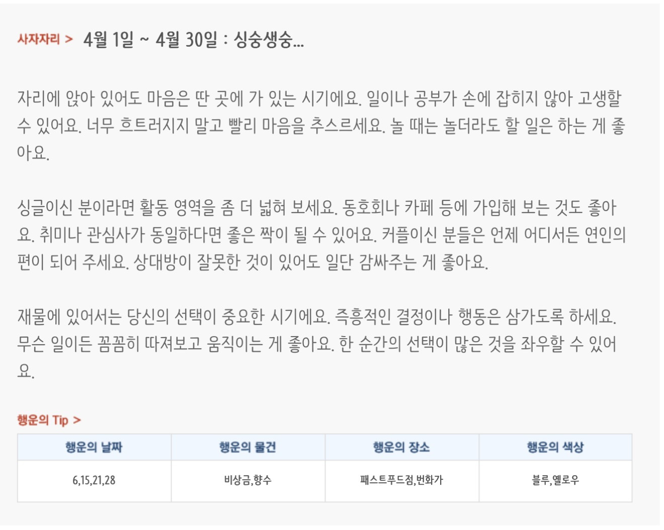 [기타]미리보는 4월 월간 별자리운세 작성자자동Bot|작성시간26.03.31|조회수854 목록 댓글 37 글자크기 작게가 글자크기 크게가 방석 위로 모여라출처 : 산수도인 다음검색 현재 게시글 추가 기능 열기 북마크 공유하기 신고 센터로 신고 댓글 댓글 37 댓글쓰기 답글쓰기 댓글 리스트 작성자내심장이라도꺼내서보여줄까 | 작성시간 26.04.01 복채 작성자Lee준영 | 작성시간 26.04.01 복채 작성자칭송 | 작성시간 26.04.01 복채 작성자ESTP | 작성시간 26.04.02 복채 작성자빨래바구니 | 작성시간 26.04.06 복채 댓글 전체보기