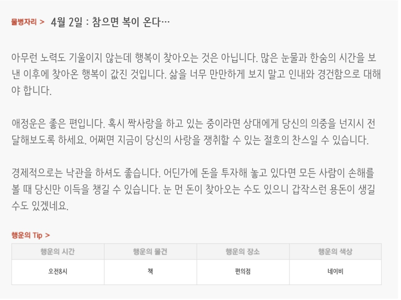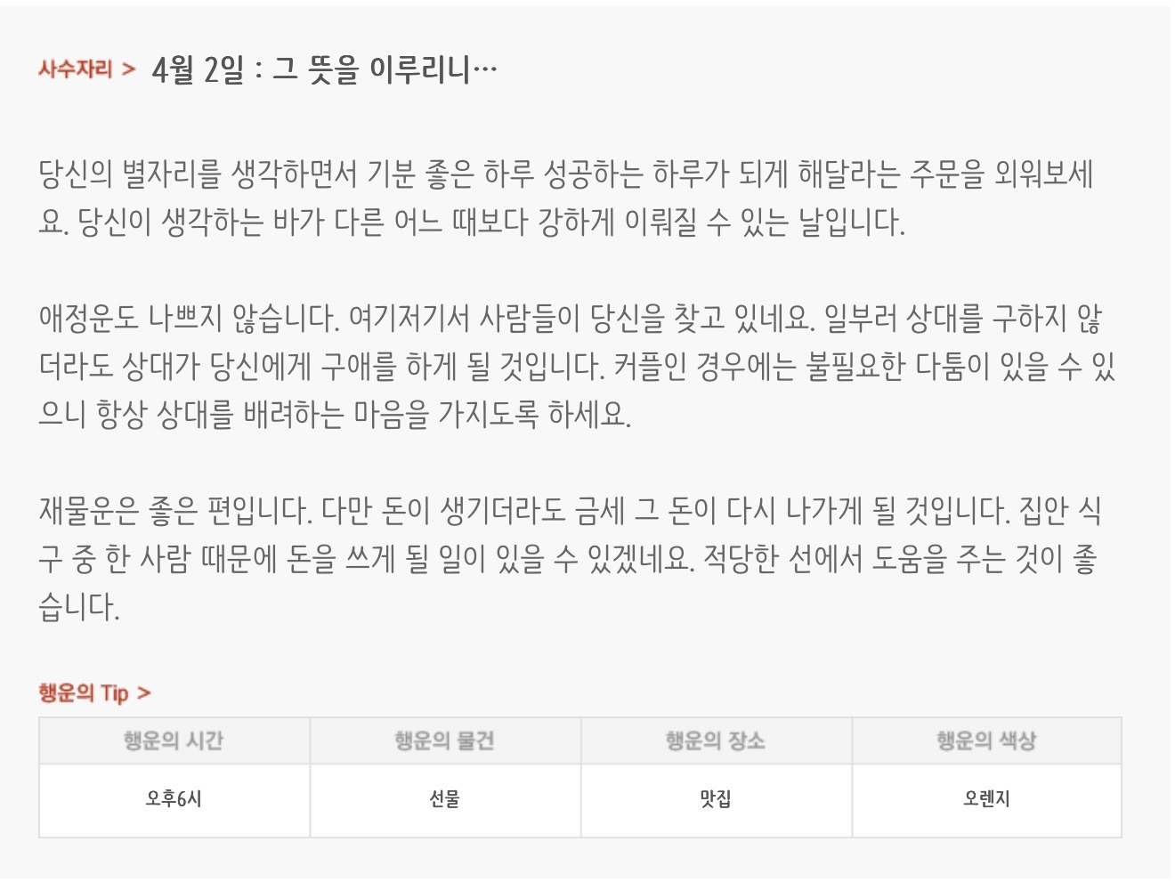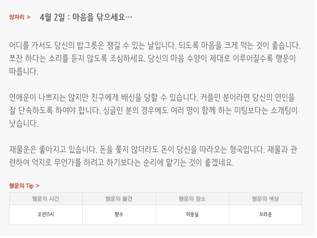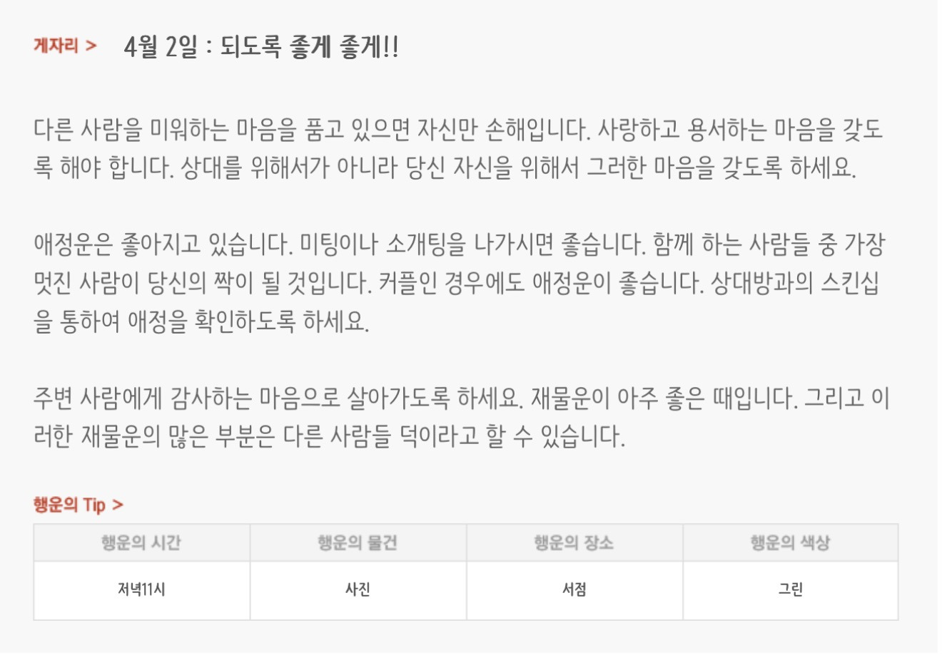 [기타]하루전에 미리보는 4월 2일 별자리운세 작성자자동Bot|작성시간26.04.01|조회수738 목록 댓글 30 글자크기 작게가 글자크기 크게가 방석 위로 모여라출처 : 산수도인 다음검색 현재 게시글 추가 기능 열기 북마크 공유하기 신고 센터로 신고 댓글 댓글 30 댓글쓰기 답글쓰기 댓글 리스트 작성자개미지옥 | 작성시간 26.04.02 복채 작성자동그라미고양이 | 작성시간 26.04.02 복채 작성자nct dream RENJUN | 작성시간 26.04.02 복채 작성자마슈마로 | 작성시간 26.04.02 복채 작성자ESTP | 작성시간 26.04.02 복채 댓글 전체보기