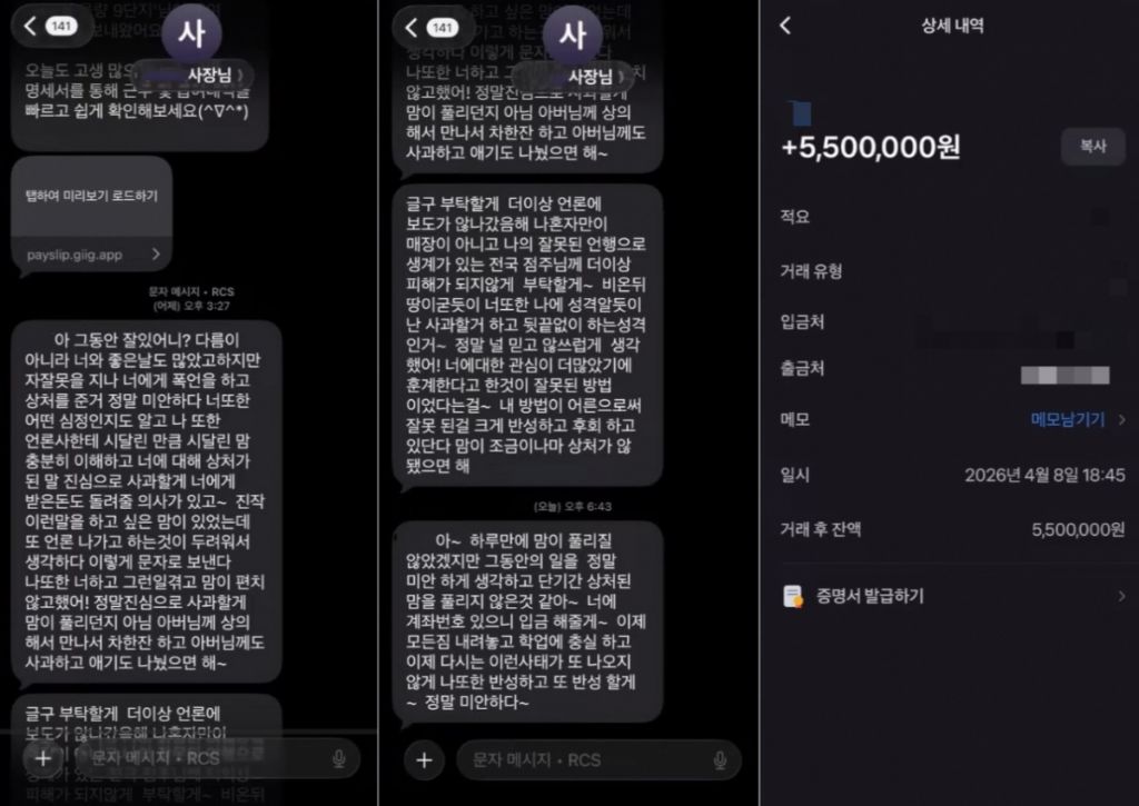 남은 음료를 챙겼다는 이유로 20대 아르바이트생에게 합의금 550만원을 받아낸 충북 청주 빽다방 카페 점주가 합의금을 전액 반환한 사실이 알려졌다.