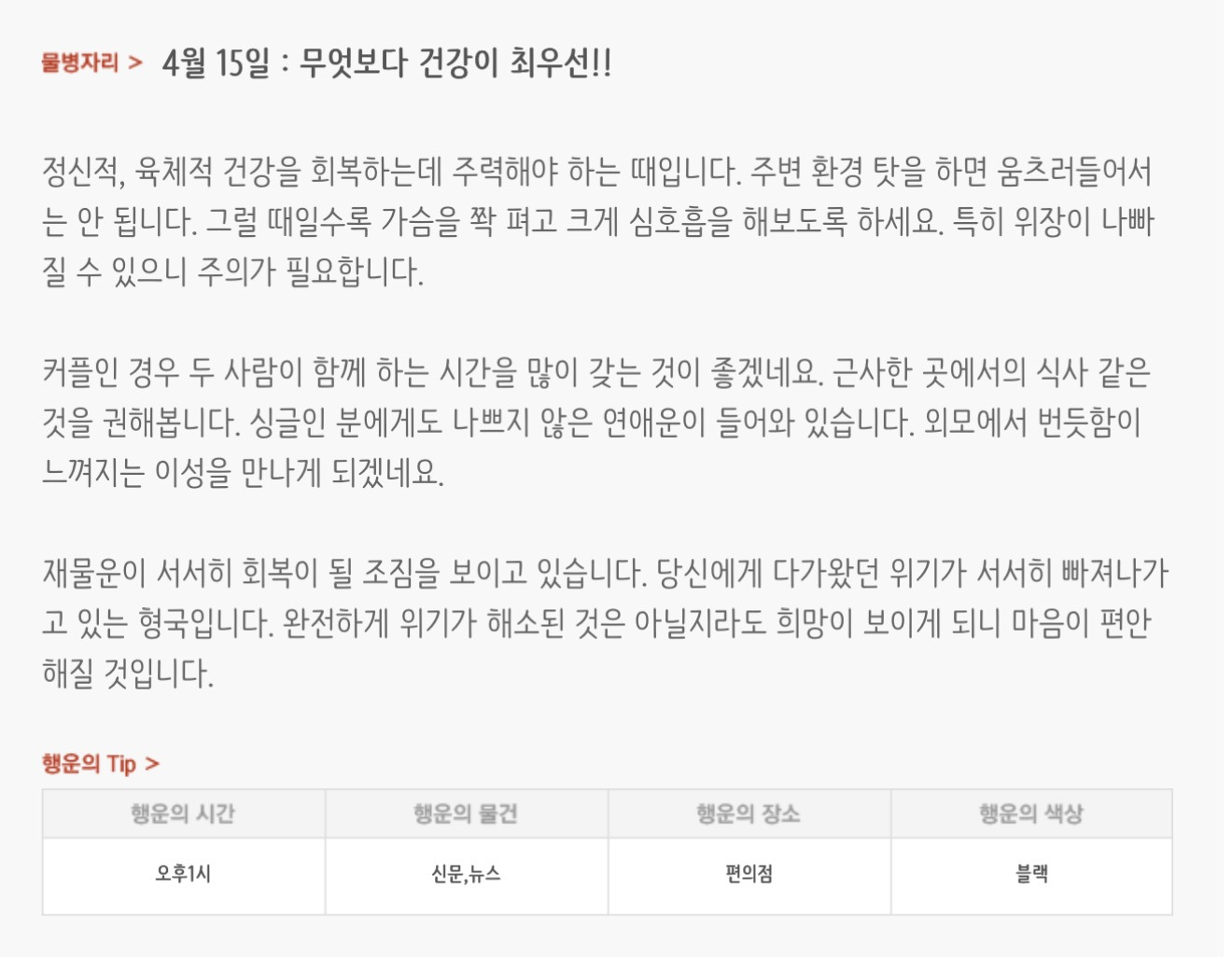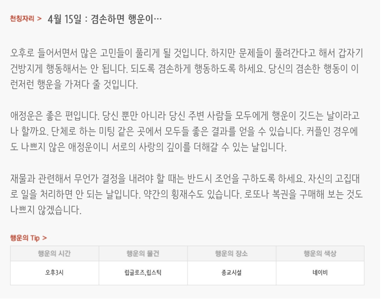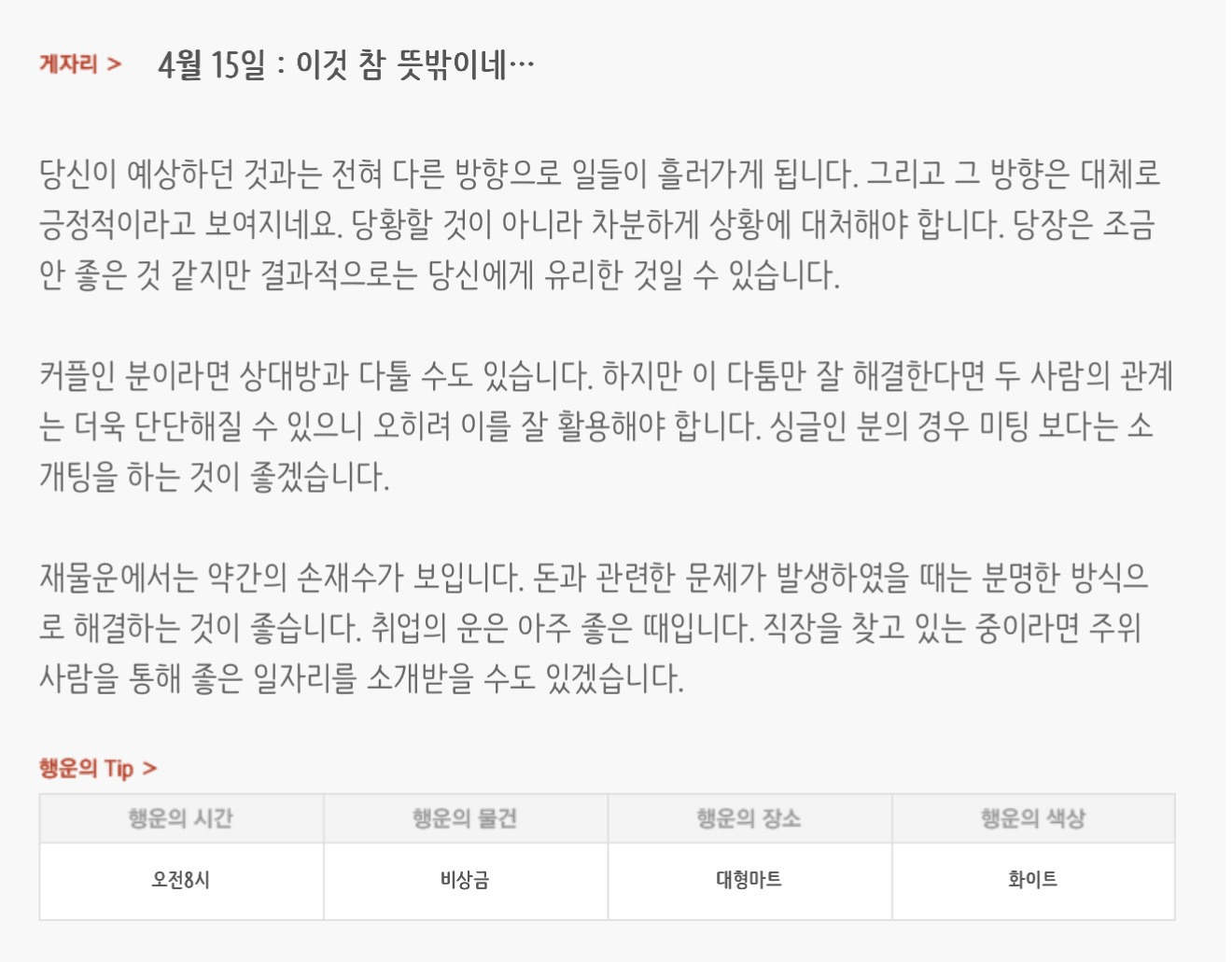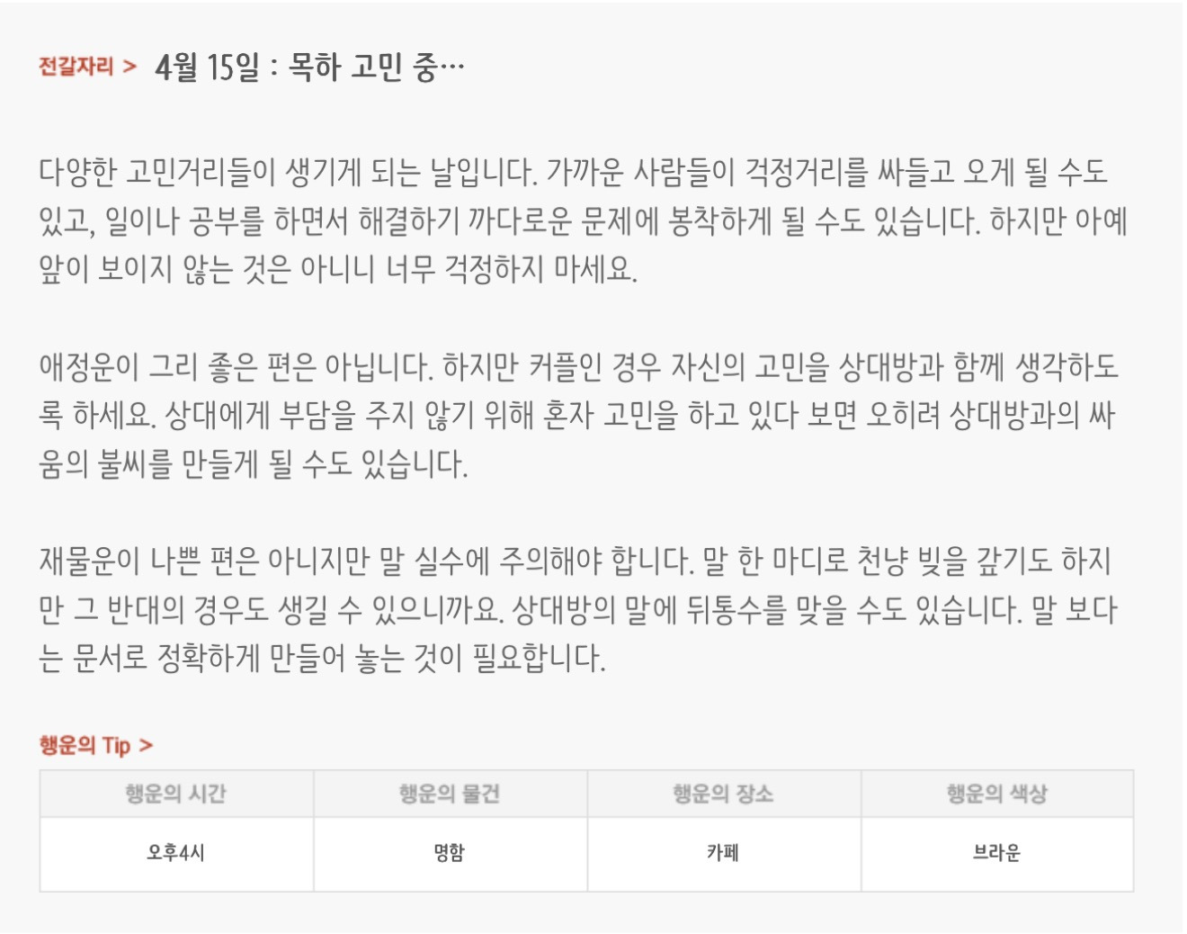 [기타]하루전에 미리보는 4월 15일 별자리운세 작성자자동Bot|작성시간26.04.14|조회수768 목록 댓글 30 글자크기 작게가 글자크기 크게가 방석 위로 모여라출처 : 산수도인 다음검색 현재 게시글 추가 기능 열기 북마크 공유하기 신고 센터로 신고 댓글 댓글 30 댓글쓰기 답글쓰기 댓글 리스트 작성자내심장이라도꺼내서보여줄까 | 작성시간 26.04.15 new 복채 작성자동그라미고양이 | 작성시간 26.04.15 new 복채 작성자nct dream RENJUN | 작성시간 26.04.15 new 복채 작성자Lee준영 | 작성시간 26.04.15 new 복채 작성자ESTP | 작성시간 26.04.15 new 복채 댓글 전체보기