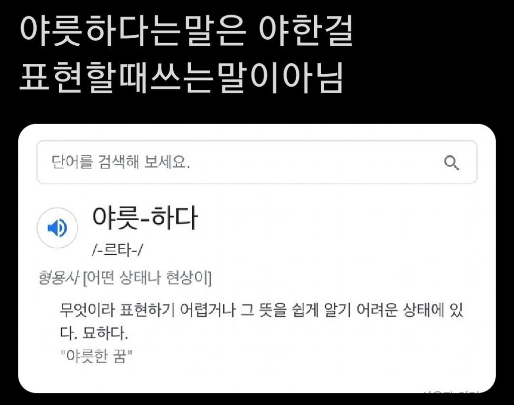 [기타]은근히 모르는 사람 제법 있는 '야릇하다' 진짜 뜻.jpg 작성자자빱자빱어디가요자빱|작성시간21.09.02|조회수4,340 목록 댓글 19 글자크기 작게가 글자크기 크게가 더쿠 펌 야하다는 뜻인 줄 아는 사람 꽤 봄ㅋㅋㅋㅋㅊㅊ https://theqoo.net/2147155286 다음검색 현재 게시글 추가 기능 열기 북마크 공유하기 신고 센터로 신고 댓글 댓글 19 댓글쓰기 답글쓰기 댓글 리스트 작성자kkb0923 | 작성시간 21.09.02 허 작성자도재정맠 | 작성시간 21.09.02 헐 작성자노랑무민 | 작성시간 21.09.02 헐 작성자SUGA (BTS) | 작성시간 21.09.03 멜랑꼴리도 우울하단뜻아닌가? 약간 저런단어 되게 많은듯 내가 아는느낌이랑 사전적정의랑 다른 작성자고기요정 | 작성시간 21.09.03 허미? 댓글 전체보기