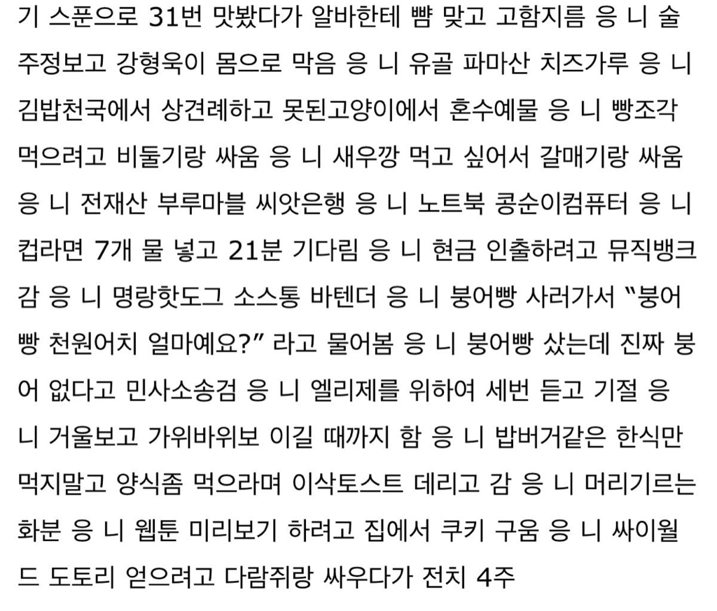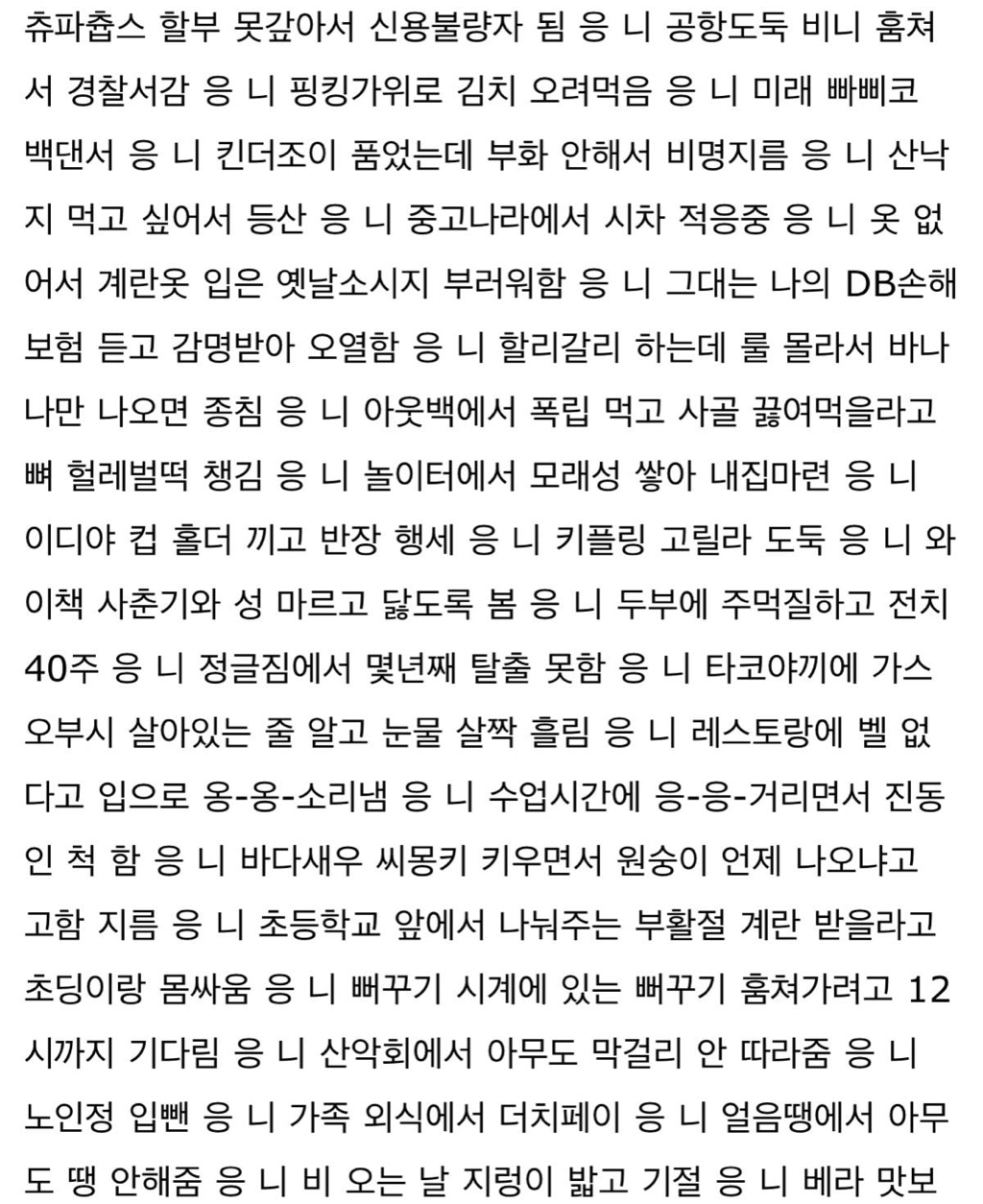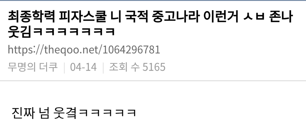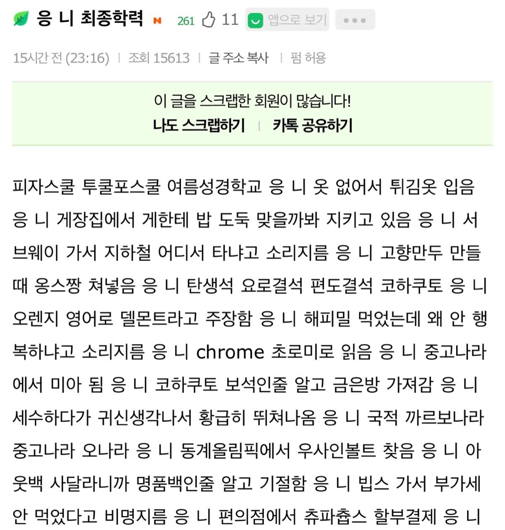 [유머]응 니 최종학력 피자스쿨 투쿨포스쿨 여름성경학교 응 니 옷 없어서 튀김옷 입음 응 니 게장집에서 게한테 밥 도둑 맞을까봐 지키고 있음 작성자이런 게 아마 마음이겠지|작성시간21.10.14|조회수2,083 목록 댓글 3 글자크기 작게가 글자크기 크게가 제목부터 터지고 들어감이게 코하쿠토코하쿠토는 예쁘기라도 하지 얘네는... 전설의 레전드 부가추 다음검색 현재 게시글 추가 기능 열기 북마크 공유하기 신고 센터로 신고 댓글 댓글 3 댓글쓰기 답글쓰기 댓글 리스트 작성자NCTDREAM 나재민 | 작성시간 21.10.14 저거 텍대로 갖고싶다 최고야 탐나 작성자궁상 | 작성시간 21.10.14 이거 원래 느개비 드립이잖앜ㅋㅋㅋㅋㅋ 개웃김 작성자이웃집 또털어 | 작성시간 21.10.14 북마크^^♥︎ 댓글 전체보기