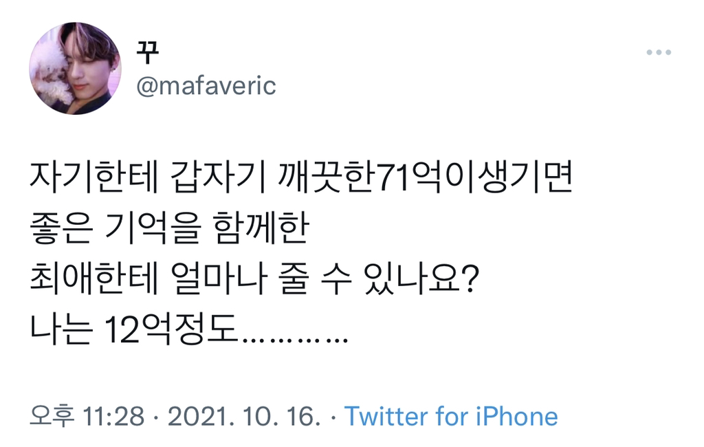 [기타]71억이 생긴다면 좋은 기억을 함께한 최애한테 얼마나 줄 수 있나요?.twt 작성자오세훈(28)|작성시간21.10.17|조회수3,447 목록 댓글 132 글자크기 작게가 글자크기 크게가 출처 : https://twitter.com/mafaveric/status/1449381708671770634?s=21 다음검색 현재 게시글 추가 기능 열기 북마크 공유하기 신고 센터로 신고 댓글 댓글 132 댓글쓰기 답글쓰기 댓글 리스트 작성자Dear DREAM | 작성시간 21.10.18 60억! 너무 많이 가지고 있어도 불안하고 더 욕심 날 것 같아 10억으로 집 사고 1억으로 하고픈거할랭 작성자뇌약간고치기 | 작성시간 21.10.18 너는 너어는 이미 내가 억 가까이 써줬자나ㅠㅠㅠㅠㅠㅠㅠ 작성자맠깅 | 작성시간 21.10.18 왜 줌 작성자김도쥉우 | 작성시간 21.10.18 미안 그 돈으로 올콘 뛸게 작성자선shine | 작성시간 21.10.18 그 좋은 추억도 내 돈 내시간 써서 만든건데 뭘 더 줘야해...?ㅠ 댓글 전체보기