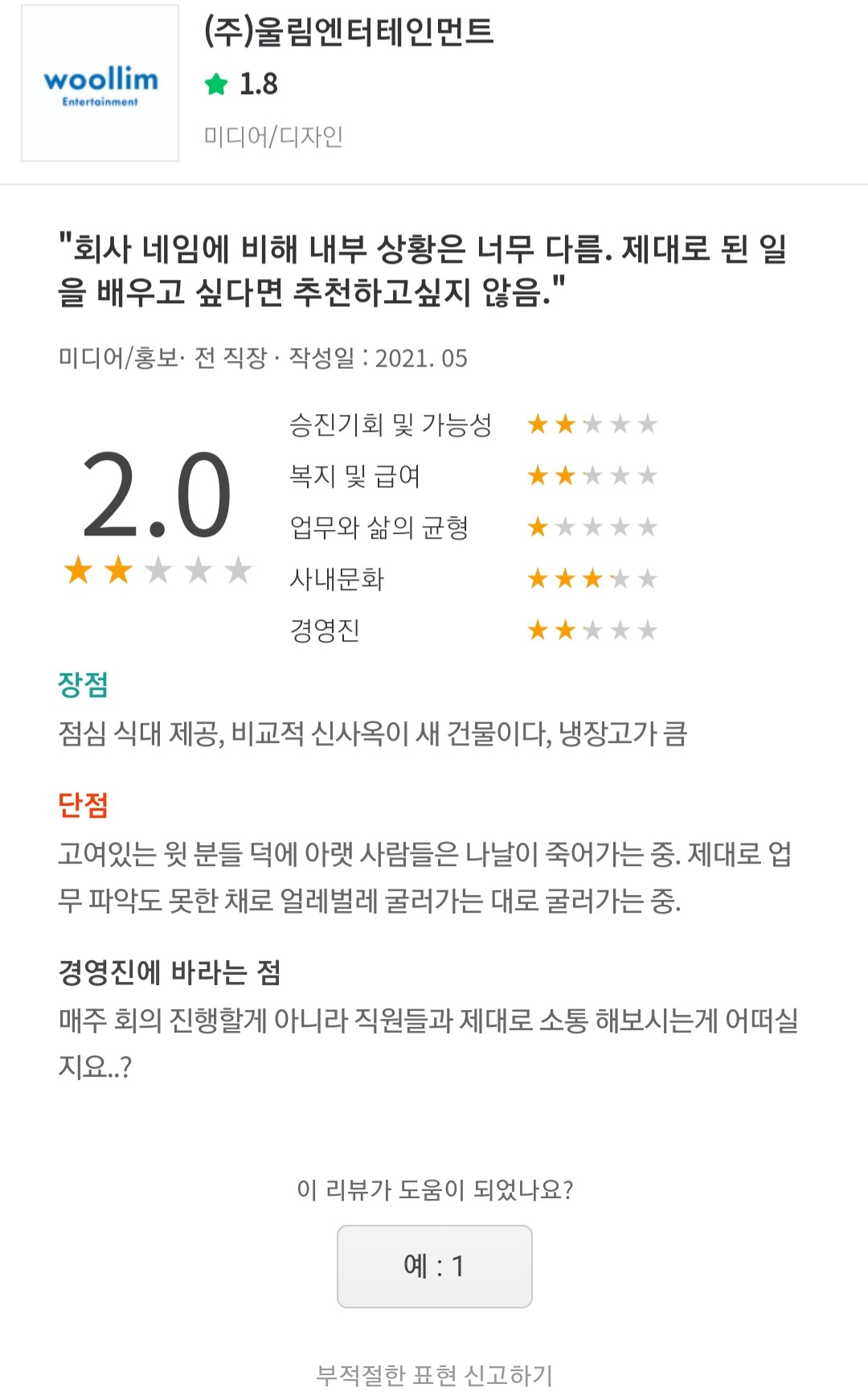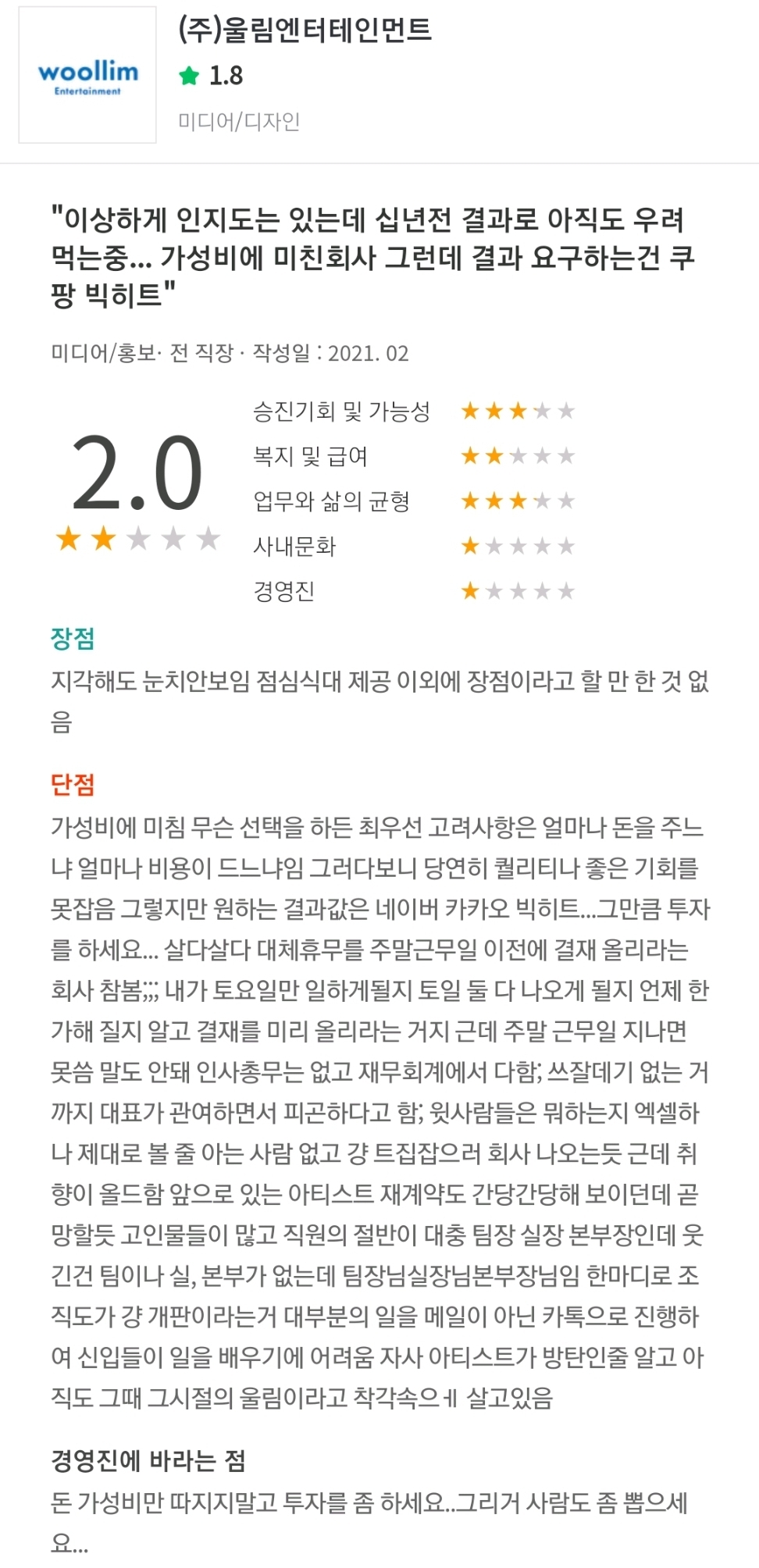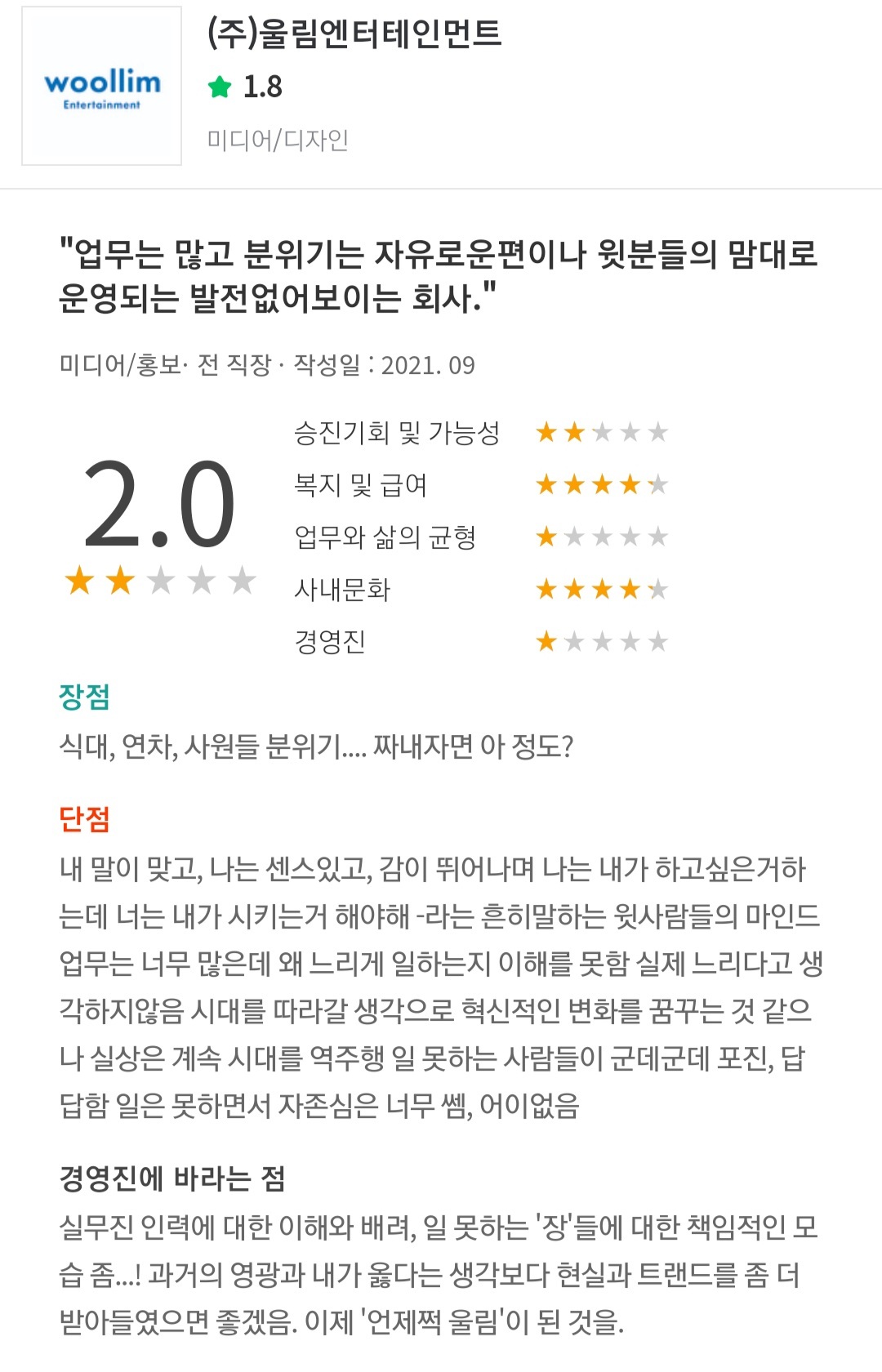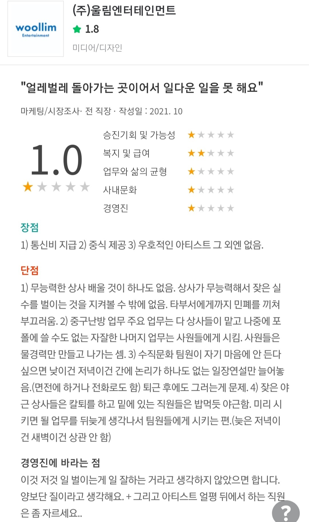 [기타]직원들이 자주 퇴사하는 울림엔터테인먼트 잡플래닛 후기 작성자울림아 기죽지마|작성시간21.11.17|조회수2,766 목록 댓글 5 글자크기 작게가 글자크기 크게가 직원들이 퇴사하면 한 줄기 빛과 같은 자체컨텐츠가 공지도 없이 끊겨서 직원이 퇴사한 게 항상 티가 나는 소속사...^^차라리 직원들이나 아티스트들 둘 중 한 곳에라도 잘해주면 좋은데 데뷔만 시킬 줄만 알지 데뷔 시키면 대우도 제대로 안 해주고 방치 시켜서 거의 20년동안 엔터 운영하면서 있는 아티스트들이랑 재계약 성공률 16.6% 밖에 안됨;+)번외혹시 몰라서 그룹 이름은 지움회사랑 관련된 일이나 대표랑 관련 된 일에만 피드백 할 줄만 아는 소속사,,,,ㅎ 다음검색 현재 게시글 추가 기능 열기 북마크 공유하기 신고 센터로 신고 댓글 댓글 5 댓글쓰기 답글쓰기 댓글 리스트 작성자성뀨 | 작성시간 21.11.17 후....썩을울림... 작성자Mark_lee | 작성시간 21.11.17 일 좀 해라 좀… 작성자rollllllin | 작성시간 21.11.17 ........우리회산가?? ㅅㅂ 우리회사같아 작성자6월 9일 | 작성시간 21.11.17 엔터 접어라~~ 작성자아리아나동그란데 | 작성시간 21.11.18 으이그 댓글 전체보기