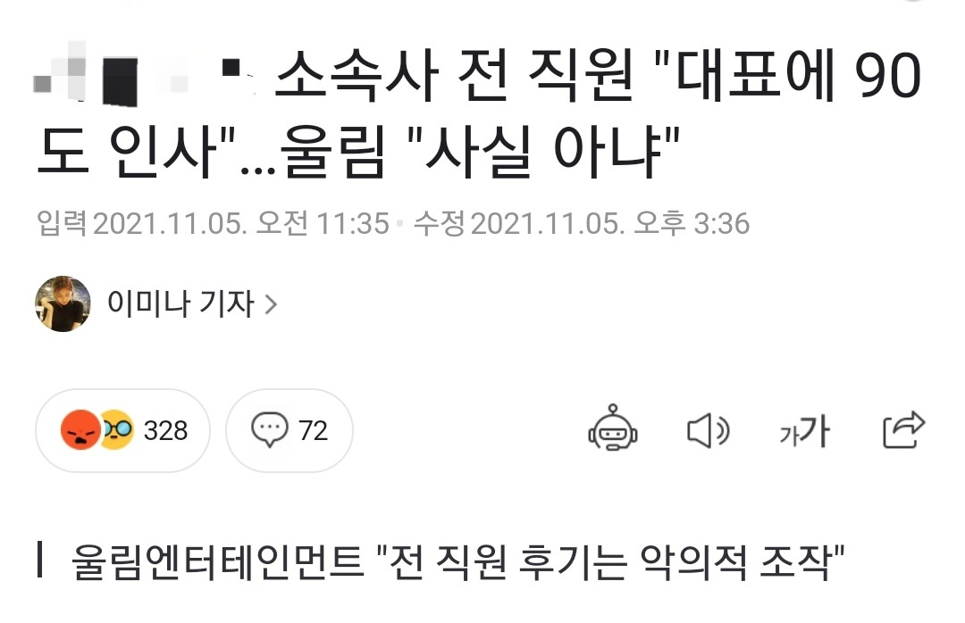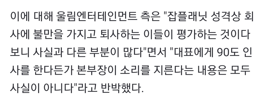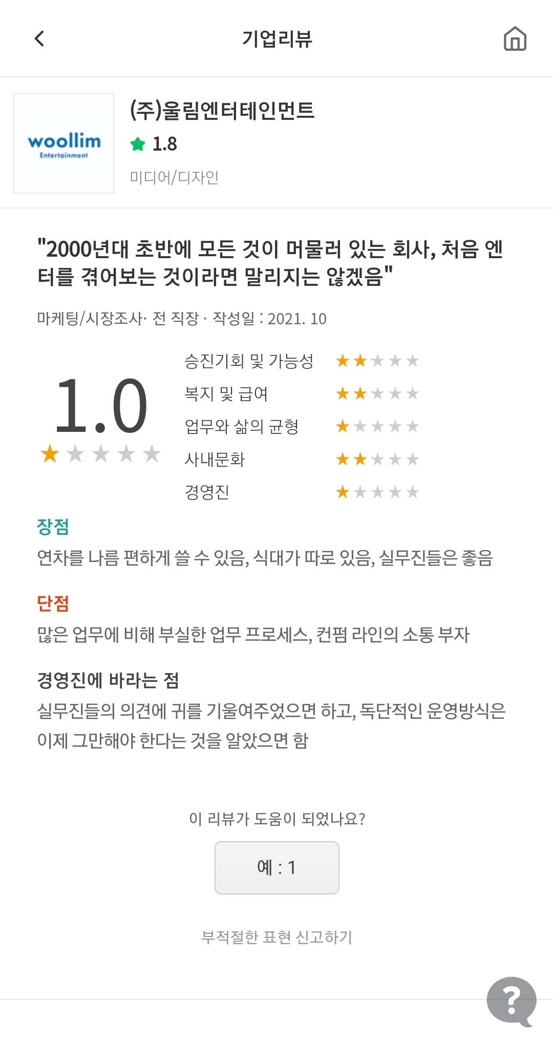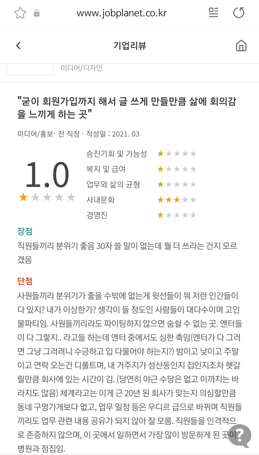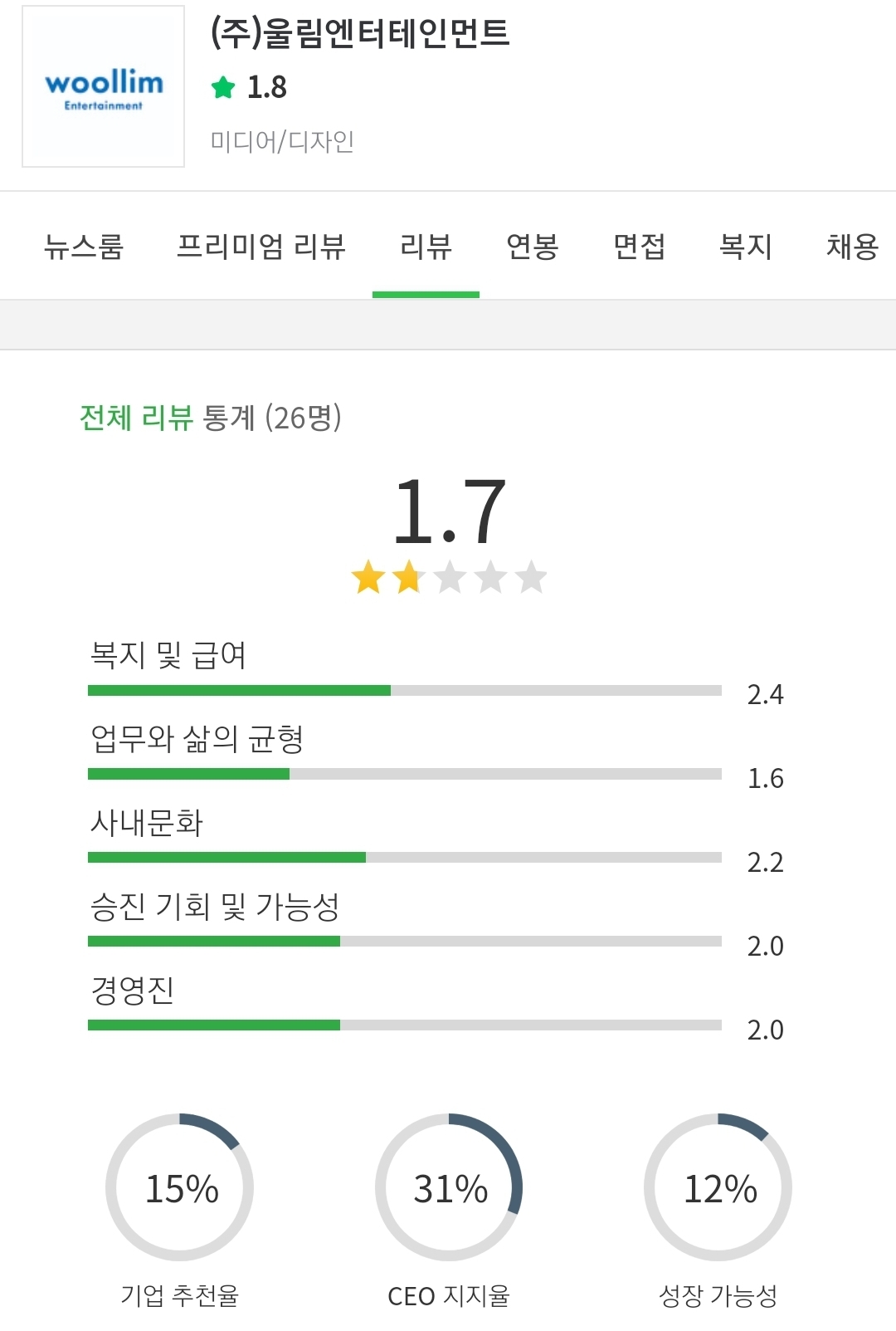 [기타]직원들이 자주 퇴사하는 울림엔터테인먼트 잡플래닛 후기 작성자울림아 기죽지마|작성시간21.11.17|조회수2,766 목록 댓글 5 글자크기 작게가 글자크기 크게가 직원들이 퇴사하면 한 줄기 빛과 같은 자체컨텐츠가 공지도 없이 끊겨서 직원이 퇴사한 게 항상 티가 나는 소속사...^^차라리 직원들이나 아티스트들 둘 중 한 곳에라도 잘해주면 좋은데 데뷔만 시킬 줄만 알지 데뷔 시키면 대우도 제대로 안 해주고 방치 시켜서 거의 20년동안 엔터 운영하면서 있는 아티스트들이랑 재계약 성공률 16.6% 밖에 안됨;+)번외혹시 몰라서 그룹 이름은 지움회사랑 관련된 일이나 대표랑 관련 된 일에만 피드백 할 줄만 아는 소속사,,,,ㅎ 다음검색 현재 게시글 추가 기능 열기 북마크 공유하기 신고 센터로 신고 댓글 댓글 5 댓글쓰기 답글쓰기 댓글 리스트 작성자성뀨 | 작성시간 21.11.17 후....썩을울림... 작성자Mark_lee | 작성시간 21.11.17 일 좀 해라 좀… 작성자rollllllin | 작성시간 21.11.17 ........우리회산가?? ㅅㅂ 우리회사같아 작성자6월 9일 | 작성시간 21.11.17 엔터 접어라~~ 작성자아리아나동그란데 | 작성시간 21.11.18 으이그 댓글 전체보기