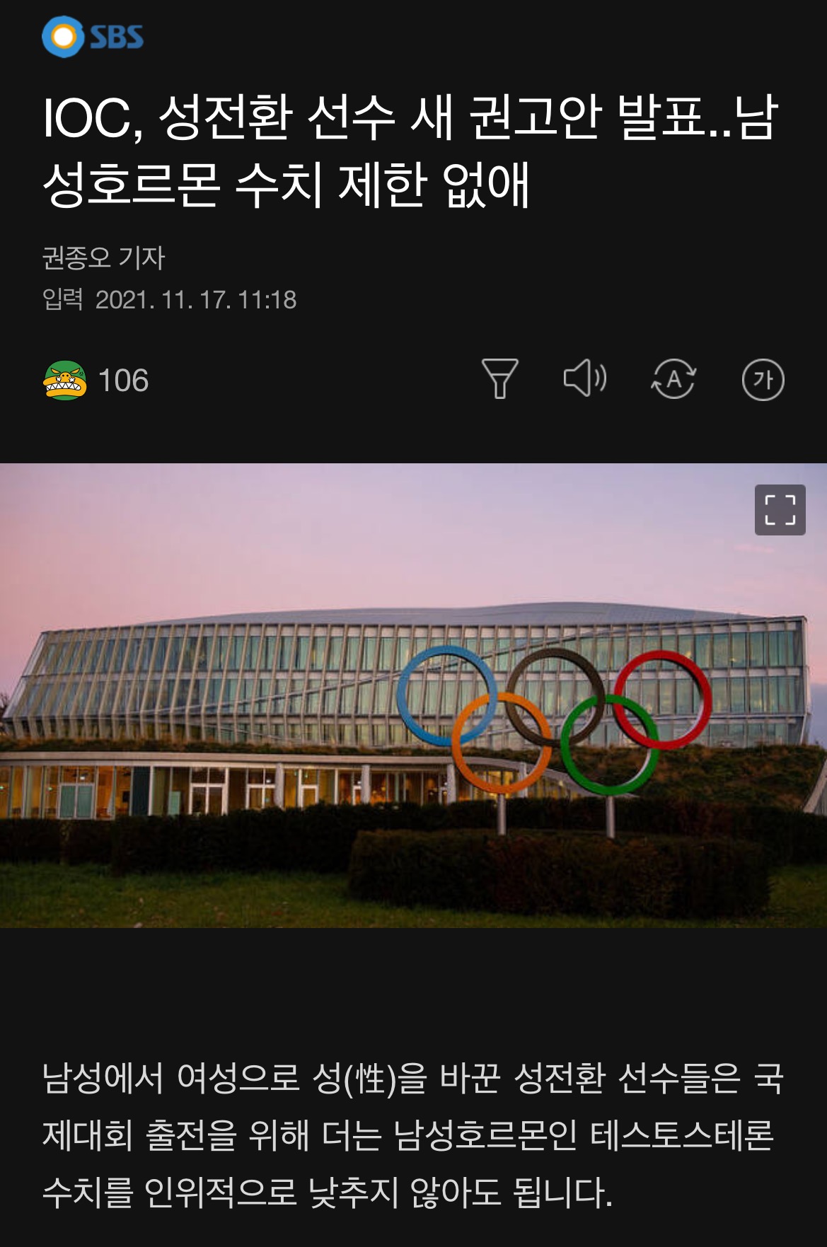 [스포츠]IOC, 성전환 선수 새 권고안 발표..남성호르몬 수치 제한 없애 작성자KIM HEE JIN|작성시간21.11.17|조회수727 목록 댓글 19 글자크기 작게가 글자크기 크게가 https://sports.v.daum.net/v/k1ysgAGawCIOC, 성전환 선수 새 권고안 발표..남성호르몬 수치 제한 없애남성에서 여성으로 성(性)을 바꾼 성전환 선수들은 국제대회 출전을 위해 더는 남성호르몬인 테스토스테론 수치를 인위적으로 낮추지 않아도 됩니다. 국제올림픽위원회(IOC)가 17일(한국시간) 성sports.v.daum.net방금 뉴스 보고 어이없어서 가져옴,,, 다음검색 현재 게시글 추가 기능 열기 북마크 공유하기 신고 센터로 신고 댓글 댓글 19 댓글쓰기 답글쓰기 댓글 리스트 작성자형태 | 작성시간 21.11.18 애초에 여성이랑 남성이랑 종목 나눠서 하는 이유가 뭔데 시발 진짜 대가리가 없는 애들만 일을 하냐? 작성자야구토끼 | 작성시간 21.11.18 으 시발 도랏나 작성자신성톡 | 작성시간 21.11.18 유전자가 여성이랑 다른데요? 걍 트젠끼리 시합 붙이든지 작성자한설우 | 작성시간 21.11.18 ...? 작성자김도쥉우 | 작성시간 21.11.19 ㅅㅂ 언제까지 봐줄건데??? 진짜 nn년 후에 이런 거 보고 얼마나 한심해할까 댓글 전체보기