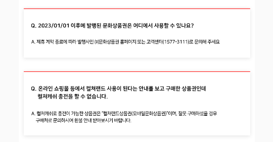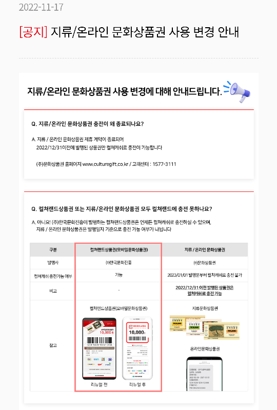 [짧생]컬쳐랜드 지류상품권 충전 불가 공지(~22/12/31 이전 발행일 : 충전가능) 작성자포모|작성시간22.11.17|조회수834 목록 댓글 4 글자크기 작게가 글자크기 크게가 23/01/01~ 발행일 지류상품권은 앞으로 컬쳐캐시로 충전 못 한대내년부터 헌혈하고 문상 받으면 충전 못 할 확률 up...대량 선물할 계획있으면 미리 사놓으면 좋을 듯 해서 @@!! 다음검색 현재 게시글 추가 기능 열기 북마크 공유하기 신고 센터로 신고 댓글 댓글 4 댓글쓰기 답글쓰기 댓글 리스트 작성자으르렁 | 작성시간 22.11.17 헐 에바야... 작성자서빈희 | 작성시간 22.11.17 에바야.. 왜이래.. 이러지마.. 작성자하늘빛 | 작성시간 22.11.18 헐 왜요... 작성자해보자해보자후회하지말고 | 작성시간 22.11.18 헐 댓글 전체보기