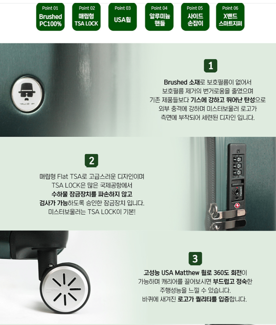 360도 회전 바퀴 + 100%PC소재 + 사이드 손잡이 라는 점이야!