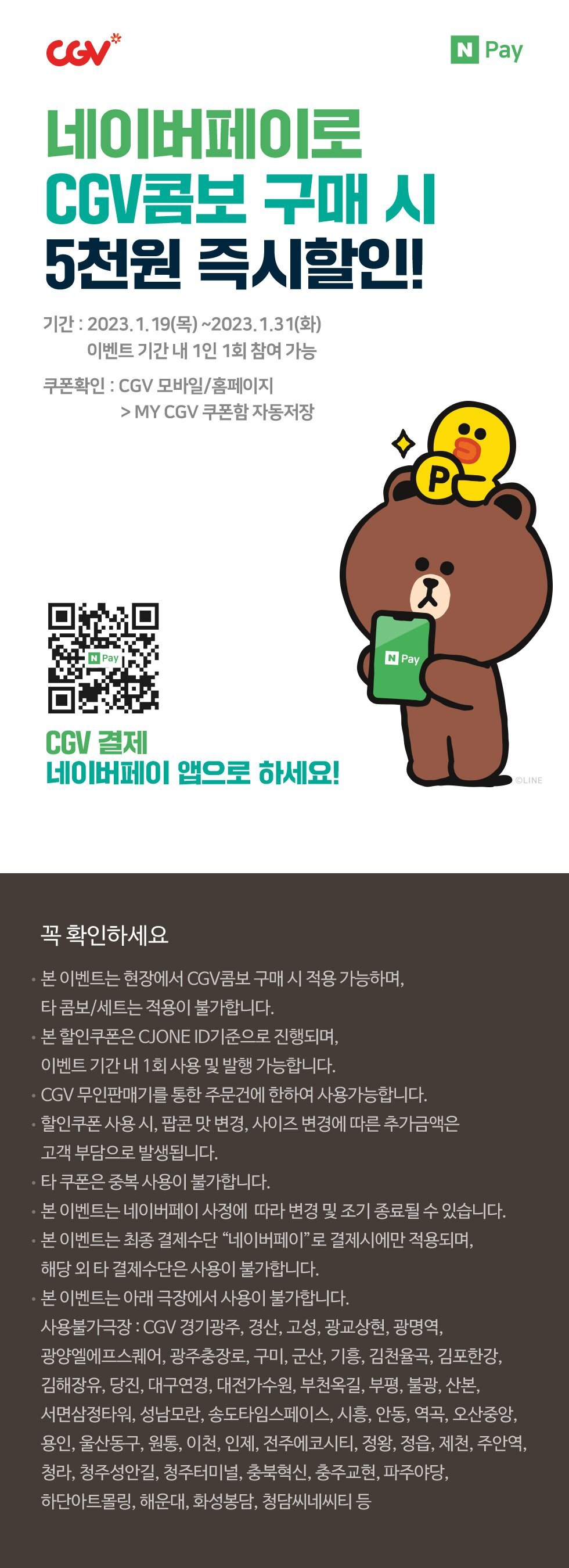[스크랩] [기타]네이버페이로 CGV콤보 구매 시 5천원 즉시할인 작성자포토이즘찰칵|작성시간23.01.22|조회수562 목록 댓글 2 글자크기 작게가 글자크기 크게가 출처 : 여성시대 핫딜 https://m.cgv.co.kr/WebApp/EventNotiV4/EventDetailGeneralUnited.aspx?seq=36205&mCode=006&iPage=1&v=213300 네이버페이 오픈기념CGV콤보 5천원 즉시할인!CJ CGVm.cgv.co.kr 롯데시네마도 할인해주라 다음검색 스크랩 원문 : *여성시대* 차분한 20대들의 알흠다운 공간 현재 게시글 추가 기능 열기 북마크 공유하기 신고 센터로 신고 댓글 댓글 2 댓글쓰기 답글쓰기 댓글 리스트 작성자NCTU 재현 | 작성시간 23.01.22 영화 볼 시간은 없는데 팝콘은 먹고 싶어 작성자희한한 시대 | 작성시간 23.01.22 헐 고마워!! 영화 예매 했는데 사먹어야지 댓글 전체보기