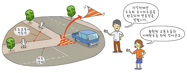 - 도시계획시설로서 도로를 결정하는 경우 도로모퉁이는 교차되는 도로의 교차각도와 폭원에 따라 「도시계획시설의 결정-구조 및 설치기준에 관한 규칙」별표에서 규정하는 기준길이 이상으로 설치해야 한다. 다만 도로의 교차방식을 교통섬, 변속차로 등을 설치하는 방식에 의하거나 로터리를 설치하는 방식에 의하는 경우에는 도로모퉁이의 길이를 당해 교차방식에 적합한 비율로 조정할 수 있다.